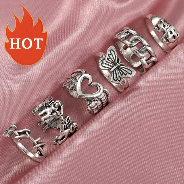 Vintage Rings Set for Women Men Aesthatic Retro Punk Silver Plated Heart Flower Butterfly Chain Finger Ring Jewelry 2022