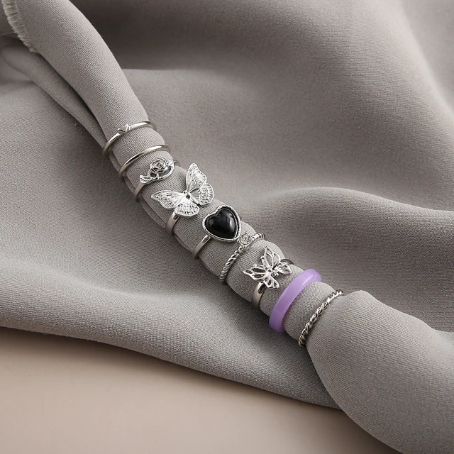 • Vintage Rings Set for Women Men Aesthatic Retro Punk Silver Plated Heart Flower Butterfly Chain Finger Ring Jewelry 2022
