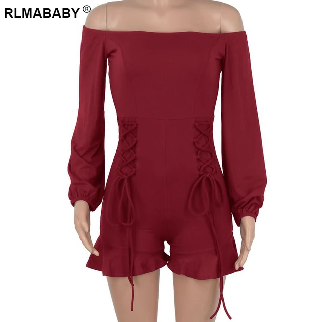 Women Off Shoulder Ruffles Hem Lace Up Playsuit Sexy Backless Long Lantern Sleeve Casual Office Lady Rompers Jumpsuit