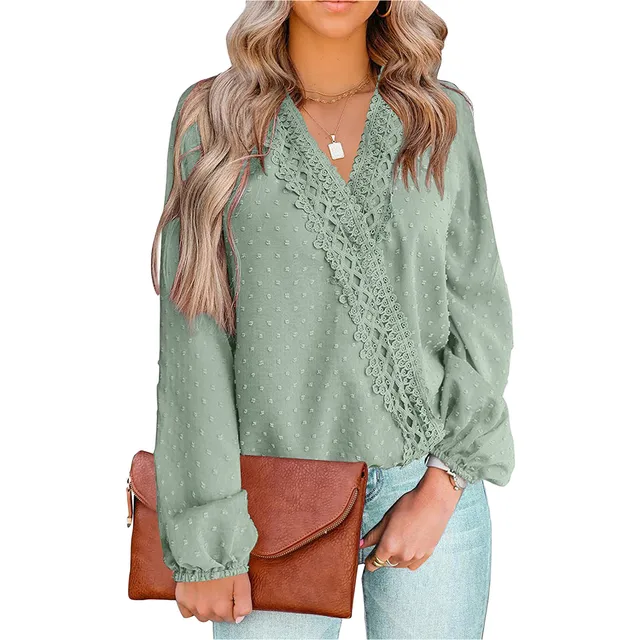 Summer Fashion Top Blouse Casual Chiffon Long Sleeve Top Blouse E;egant V Neck Solid Color Top
