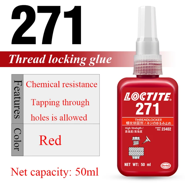 -271(red) Typical use: For locking studs and pressed in parts, suitable for heavy machinery. For locking and sealing of thread up to M36. It has excellent rust resistance and corrosion resistance. Remove with tools after heating.