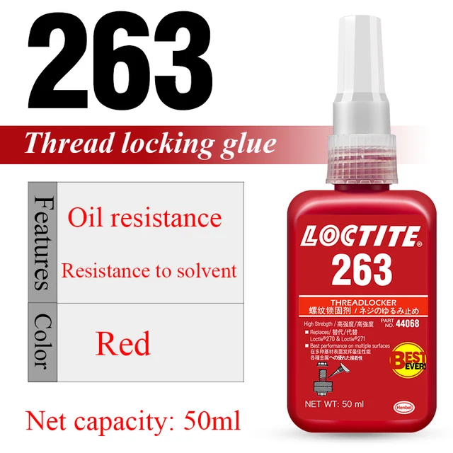 -263(red) Typical use: for locking and sealing of threads up to M36. It has heat resistance of 180 degrees Celsius, oil resistance and aging resistance.
