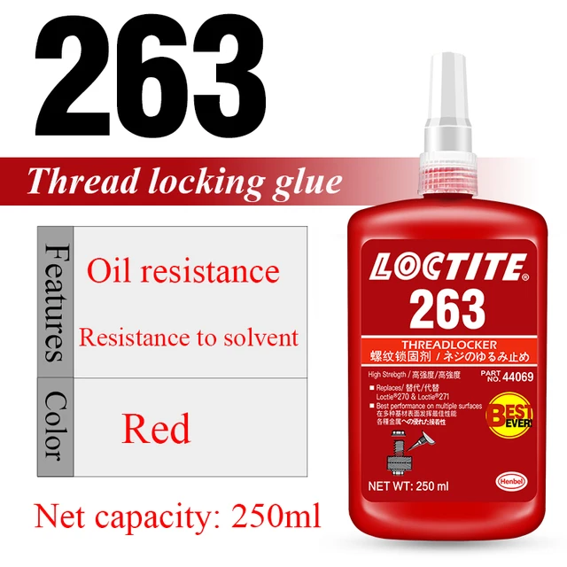 -263(red) Typical use: for locking and sealing of threads up to M36. It has heat resistance of 180 degrees Celsius, oil resistance and aging resistance.