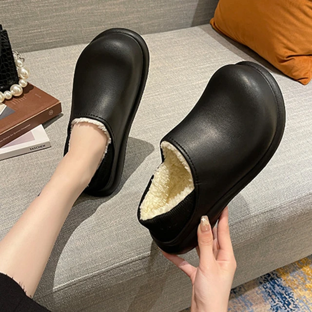 • Winter Leather Waterproof Slippers Warm Men Shoes Women Couples Non-Slip Plush Cotton Indoor Outdoor Cozy Home Autumn Flats