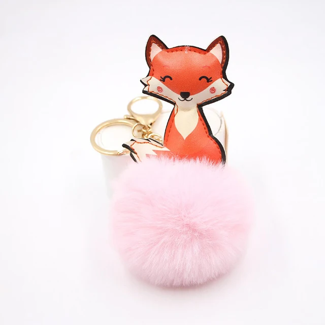 • Ball Keychain Charm Key Ring Cute Leather Fox Keyring Plush Fluffy Pompom Faux Rabbit Fur Ball Bag Car Key Charms Accessory
