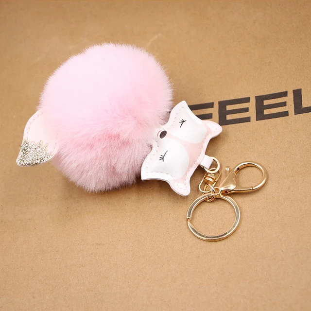 • Ball Keychain Charm Key Ring Cute Leather Fox Keyring Plush Fluffy Pompom Faux Rabbit Fur Ball Bag Car Key Charms Accessory