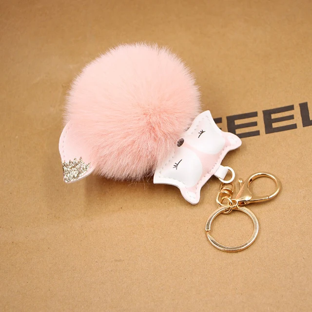 • Ball Keychain Charm Key Ring Cute Leather Fox Keyring Plush Fluffy Pompom Faux Rabbit Fur Ball Bag Car Key Charms Accessory
