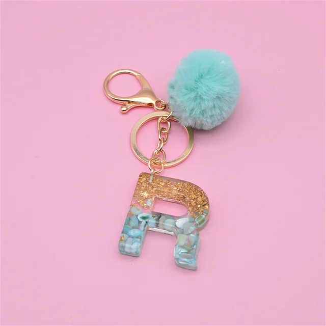 • Blue Pompom Letter Keychain English Alphabet Keyring Glitter Gradient Resin Car Mirror Accessory Women Handbag Charms