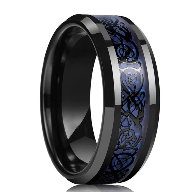 • Men's 8mm Black Tungsten Wedding Celtic Dragon Ring Inlaid Red Zircon Punk Stainless Steel Red Carbon Fibre Ring For Men