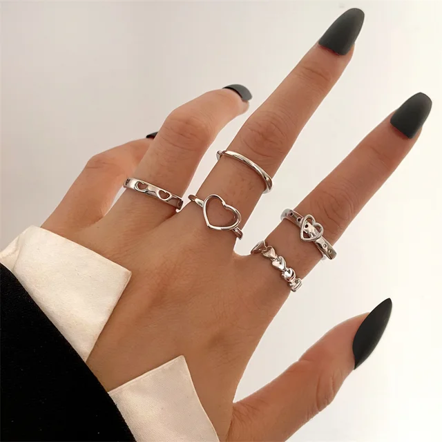 • Heart Rings Set Silver Black Alloy Hollow Pearl Love Rings Couples Lovers Valentine's Day Party Gift for Women Girls