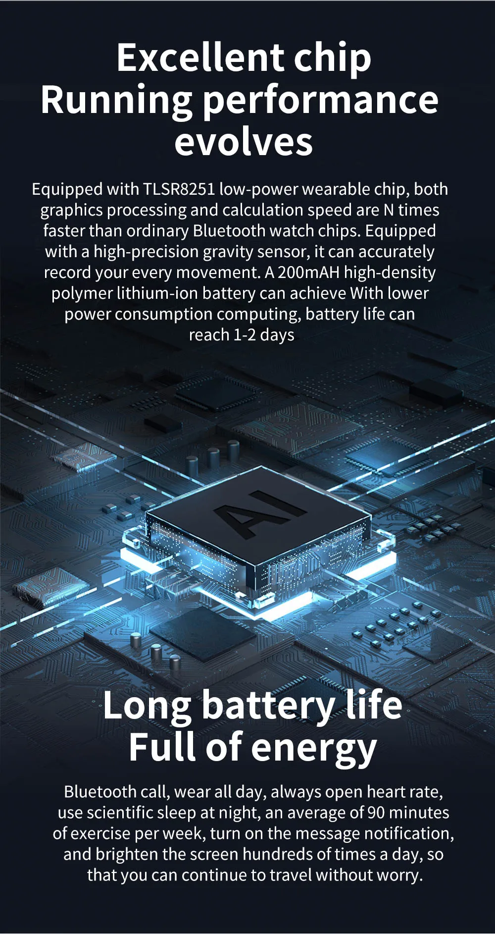 The watch can monitor the steps, calories, heart rate, distance, sleep quality, etc. Of the day. At the same time, it can connected to a smart phone to view information, remotely take pictures, retrieve mobile phones and other thoughtful and convenient functions to make your life more convenient.