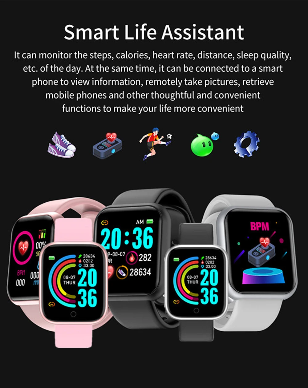 The watch can monitor the steps, calories, heart rate, distance, sleep quality, etc. Of the day. At the same time, it can connected to a smart phone to view information, remotely take pictures, retrieve mobile phones and other thoughtful and convenient functions to make your life more convenient.