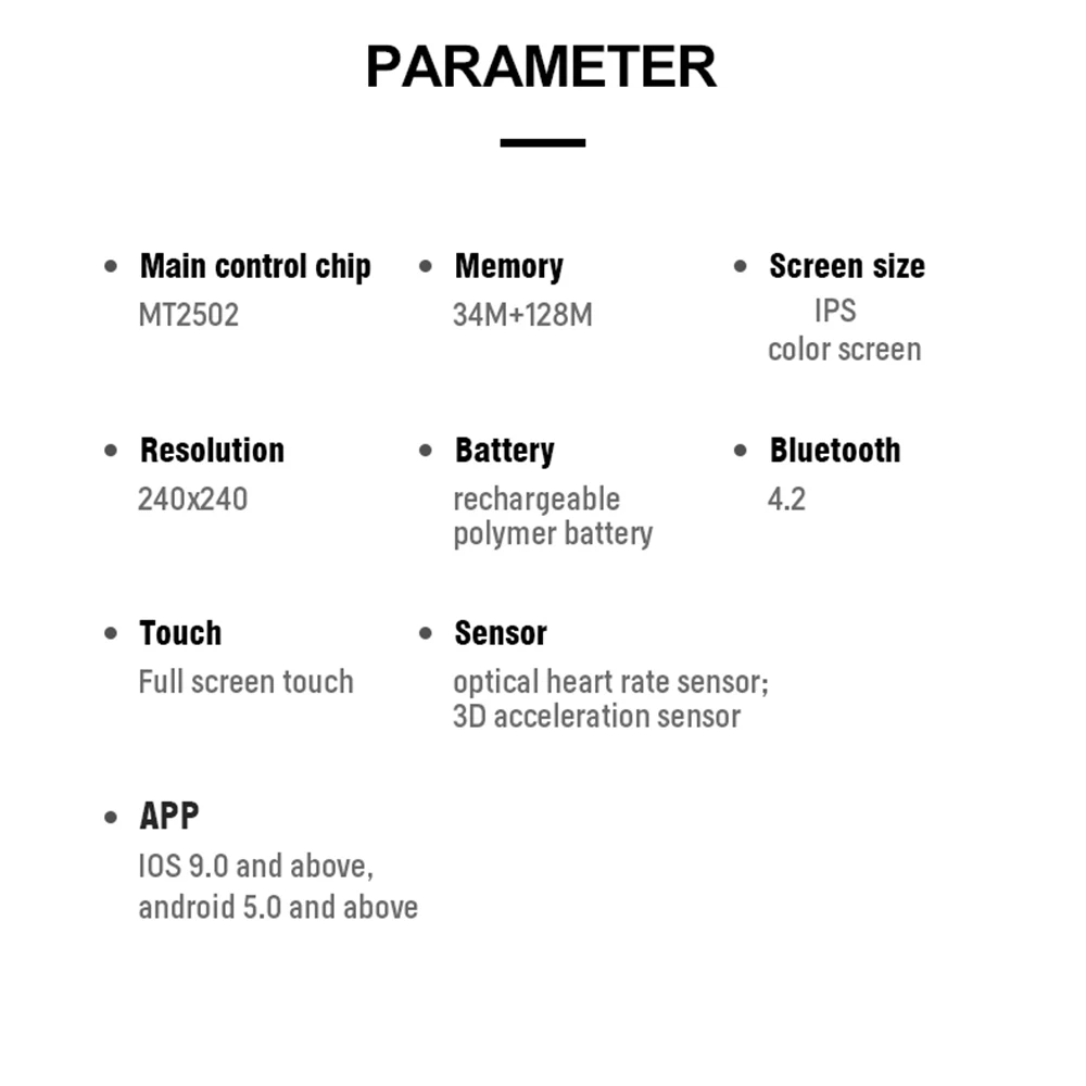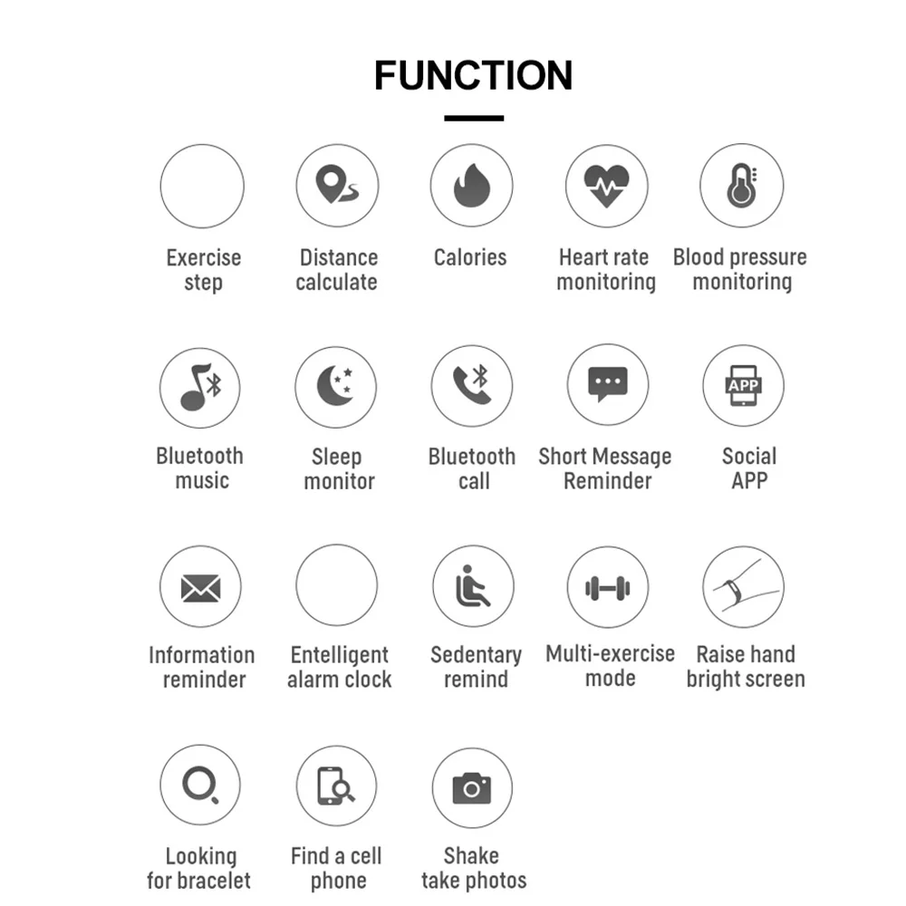 Real-time heart rate measurement (dynamic, static), blood pressure, blood oxygen measurement, sleep mode