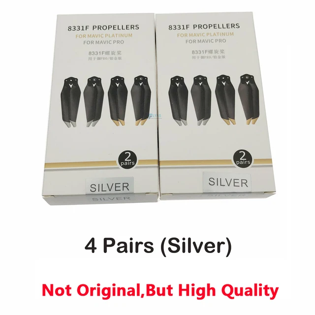 The 8331 propellers have a brand new aerodynamic design giving the Mavic Pro series an impressive noise control performance. When used with the Mavic Pro Platinum, up to 4dB (60%) of aircraft noise is lowered during takeoff and landing, and flight time is extended to 30 minutes. Noise reduction and flight time are also enhanced when used with the Mavic Pro, but not as much.