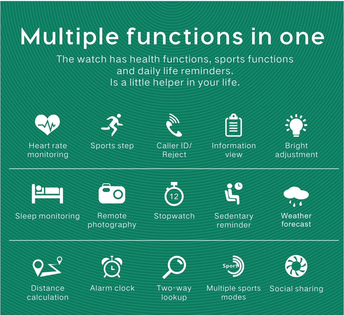 Other functionsWhole snack rate monitoring,Blood pressure monitoring,Multiple sports modes,Caller ID and rejection,Synchronized view,bright adjustment,APP motion track,Remote photography,Stopwatch,Find  phone,Daily reminder(QQ,Wechat,Facebook,whatsapp,twitter,line,kakaoTalk)