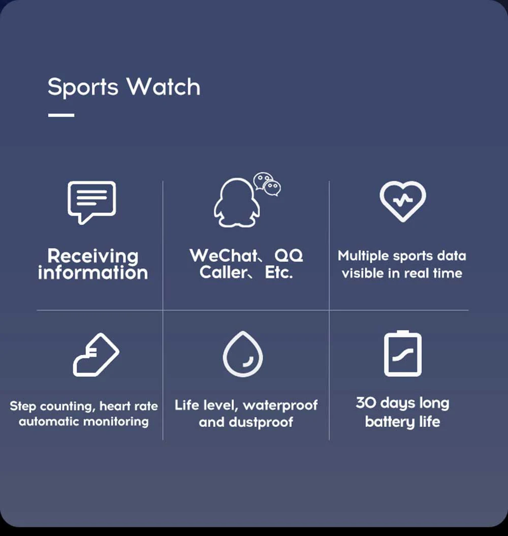 The watch can monitor the steps, calories, heart rate, distance, sleep quality, etc. Of the day. At the same time, it can connected to a smart phone to view information, remotely take pictures, retrieve mobile phones and other thoughtful and convenient functions to make your life more convenient.
