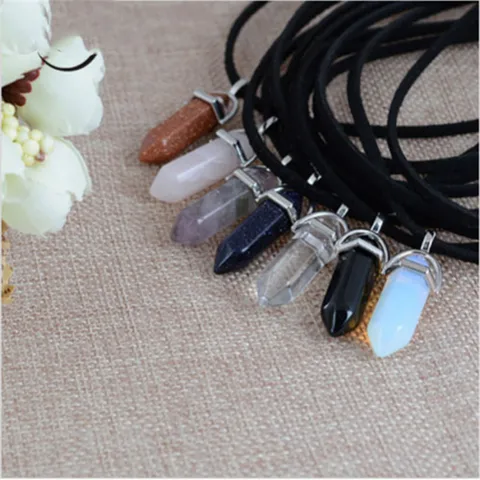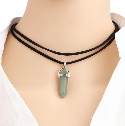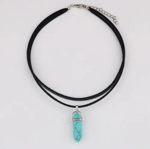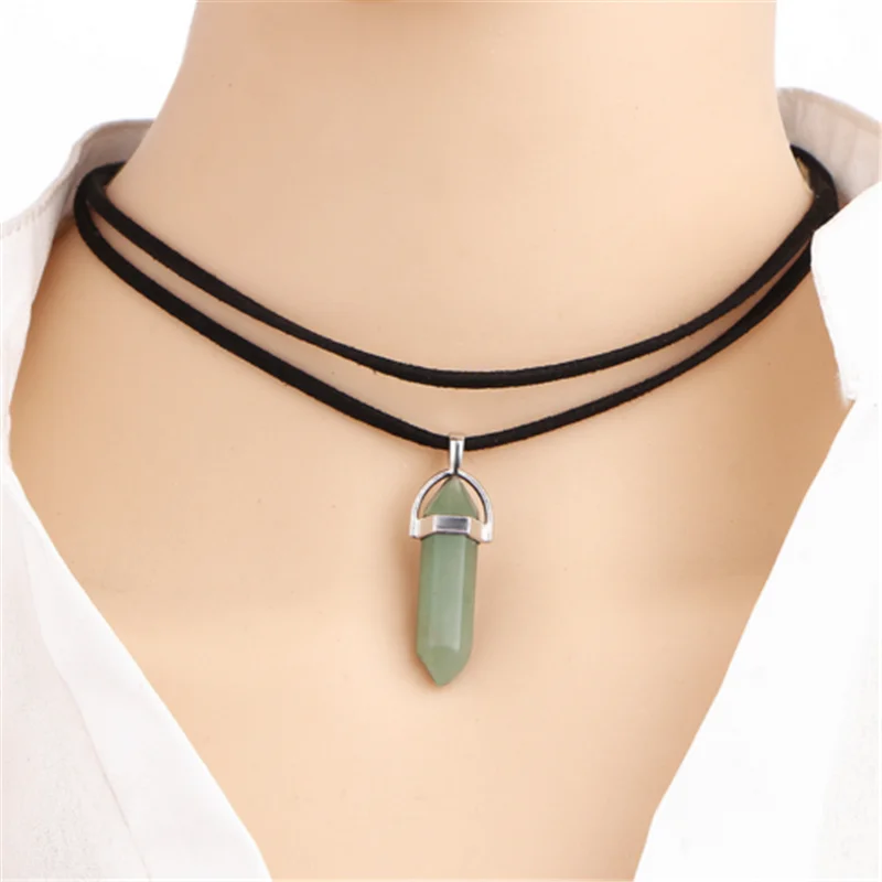 Crystal Chakra Pendulum Pendant Necklaces For Women Teens Girls Hexagonal Stone Leather Choker Chain Statement Necklace