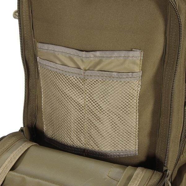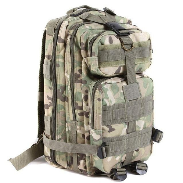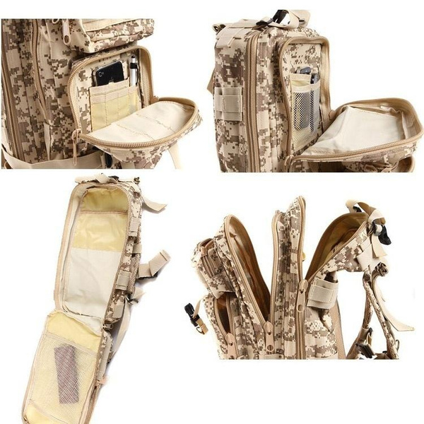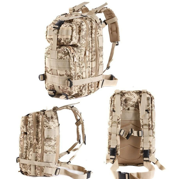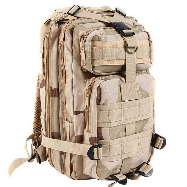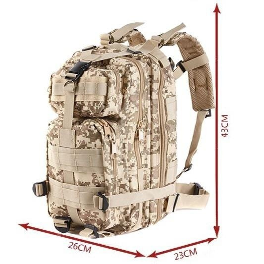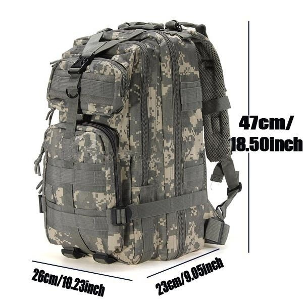 US 3P Tactical Backpack Size: W26*D23*H43cm Material: 600D nylon Fabric with coating Capacity: about 30L (24L main compartment,5L front pocket) This 3P backpack is designed for city rangers and outdoor players. It has a very cute apperance and good internal capacity.