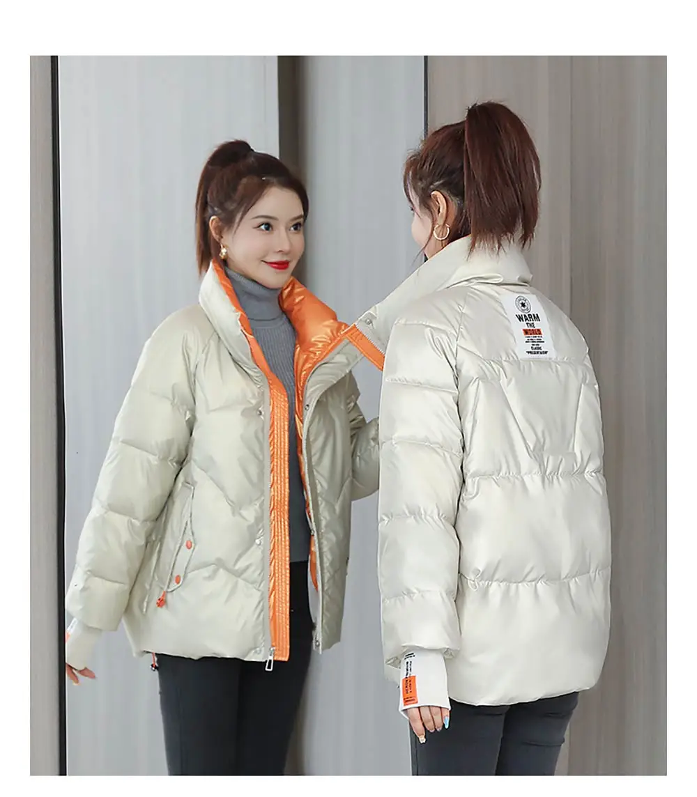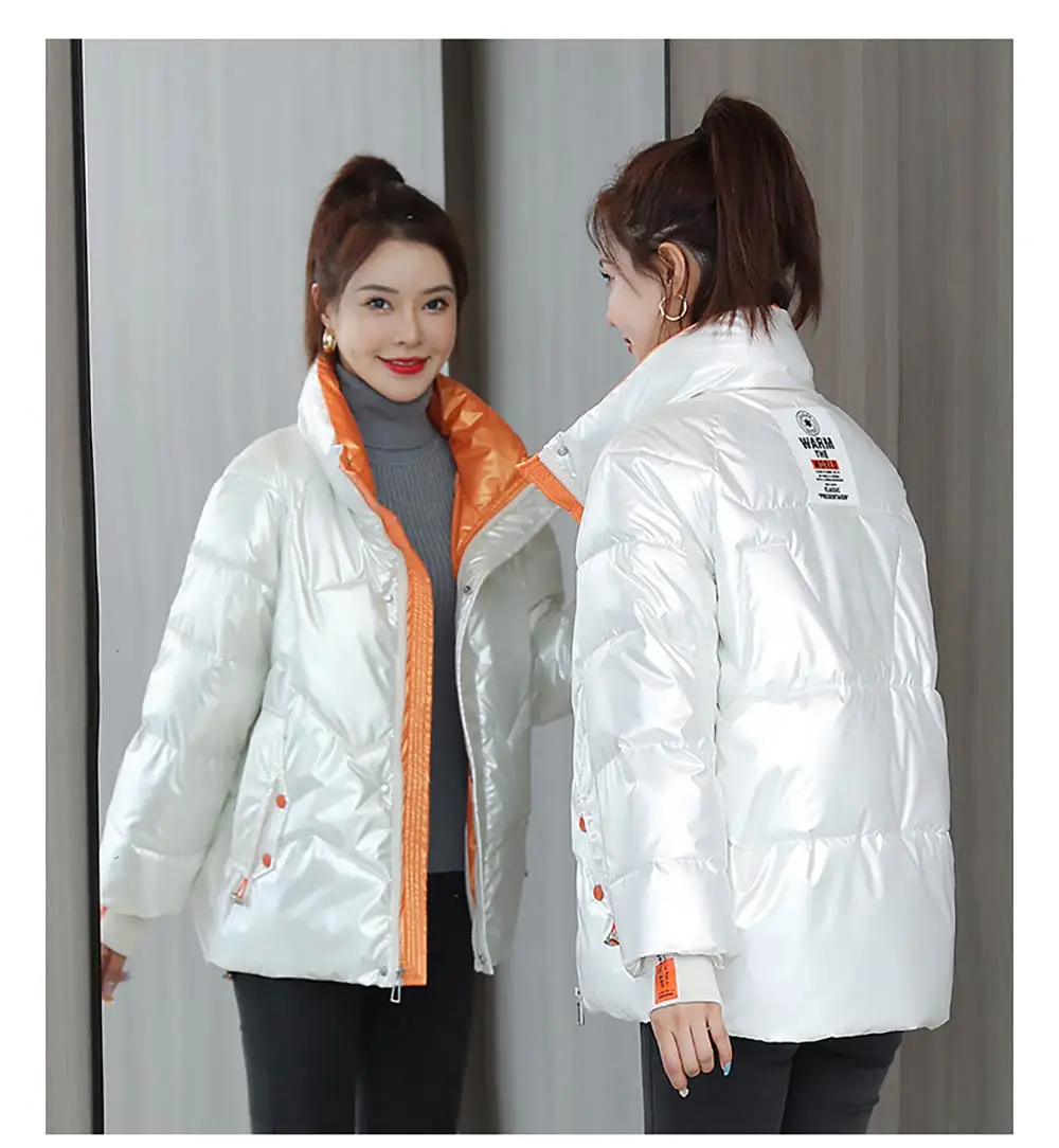 2021 New Fashion Shinny Women Winter Jacket Shining Fabric Cotton Padded Warm Thicken Short Stand Collar Coat Parka Female Coats