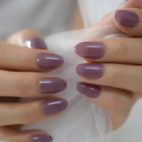 Pure Color Nails UV Polish Oval Faux Nails Light Taro Purple Glossy Nail Artificial Tips with Gluetabs 24pcs