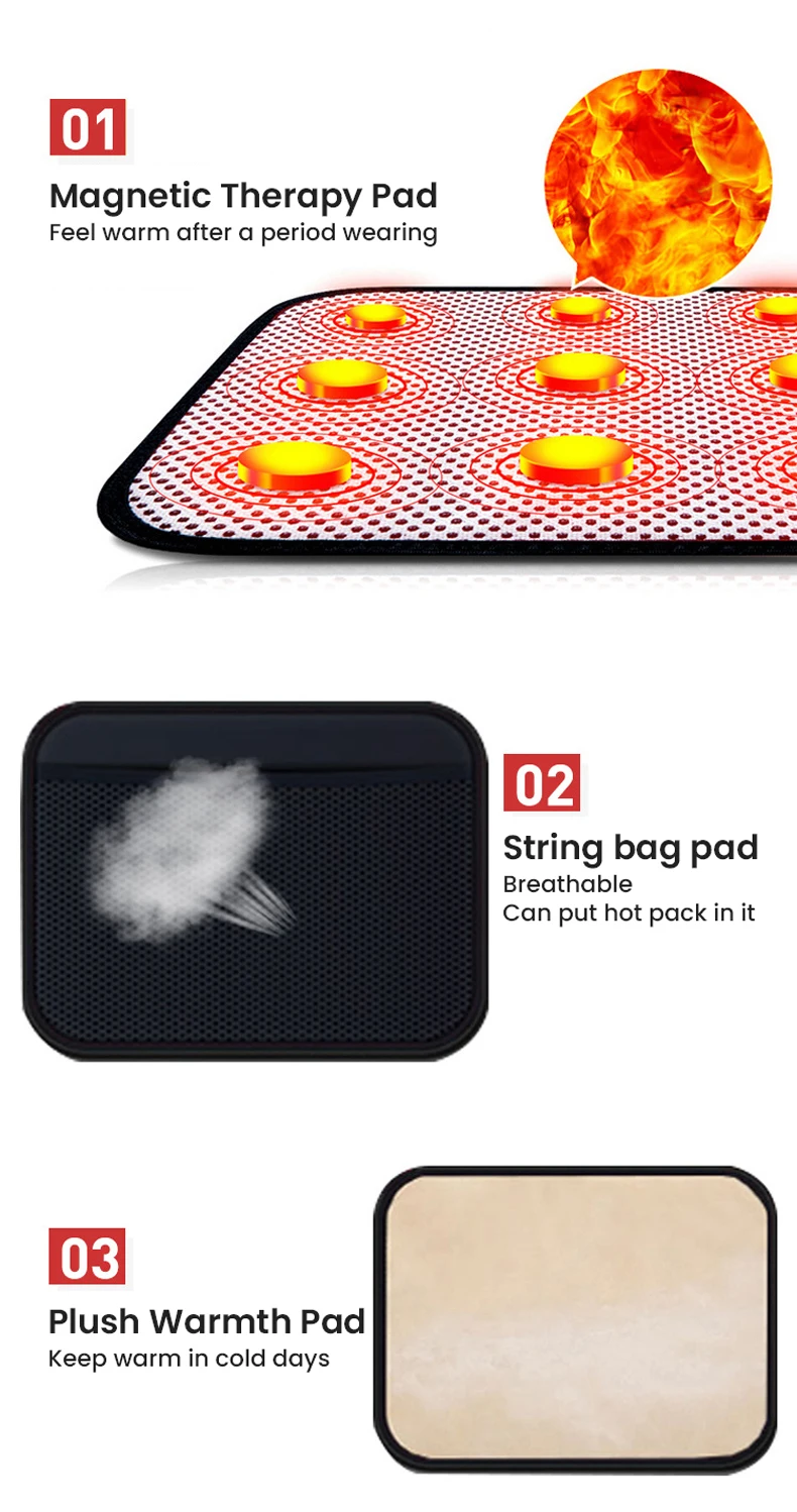 3.3 types of therapy pads: Magnetic therapy pad / Plush warmth pad / Pad with tring bag, can put hot pack or moxibustion pack in it.