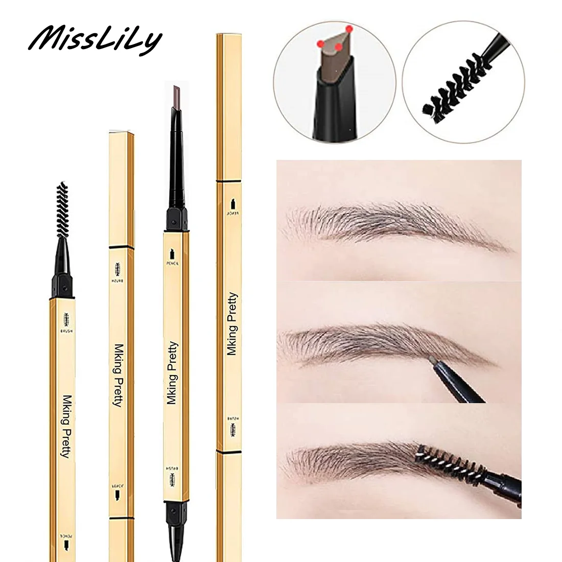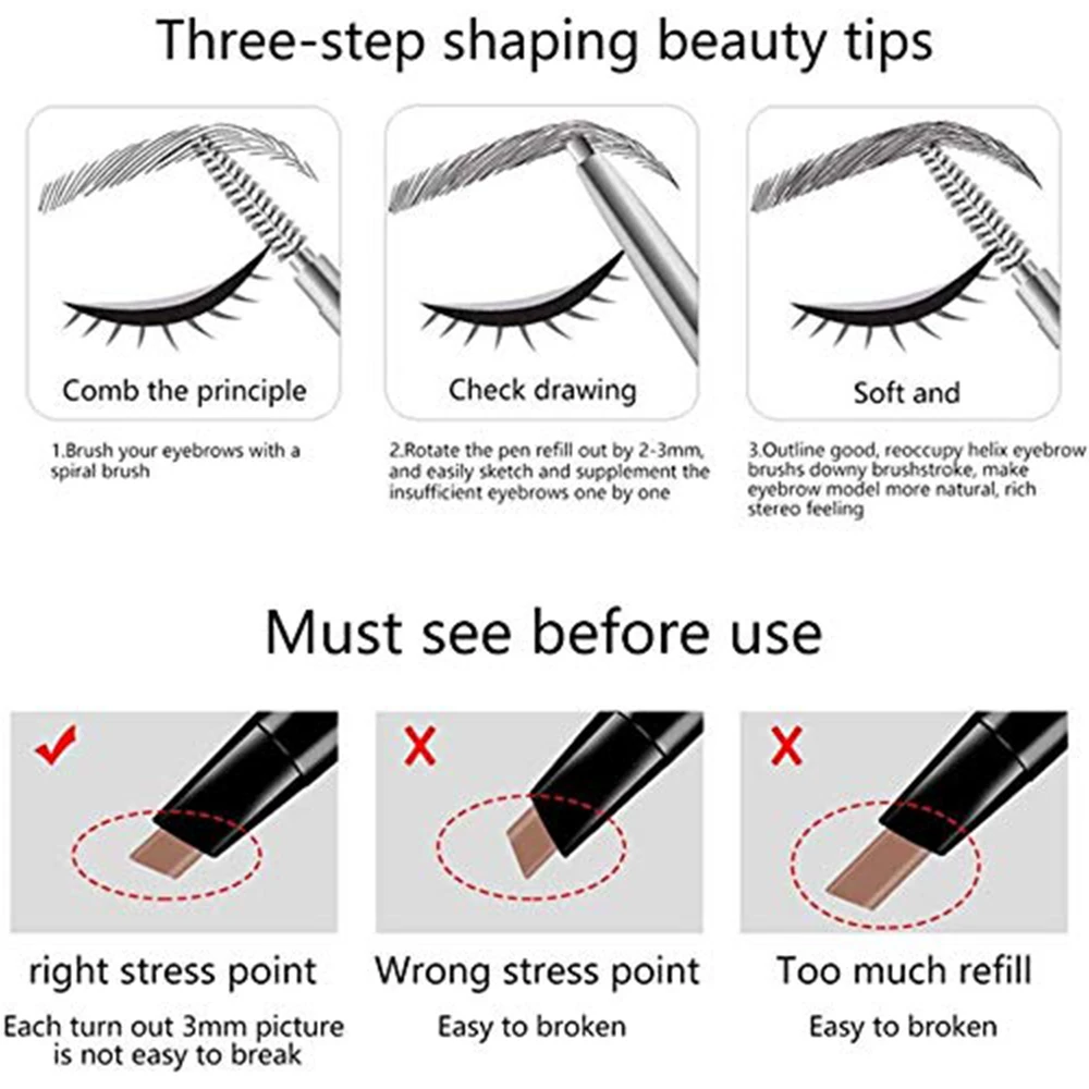 1. Eyebrow pencil,Eyebrow Makeup with Dual Ends,featuring a teardop tip,precisely outlines, easily shades,evenly fills in brows.Using the fine point of the triangle-tipped pencil, create hairlike strokes by applying light pressure and swiping in the direction that hair grows