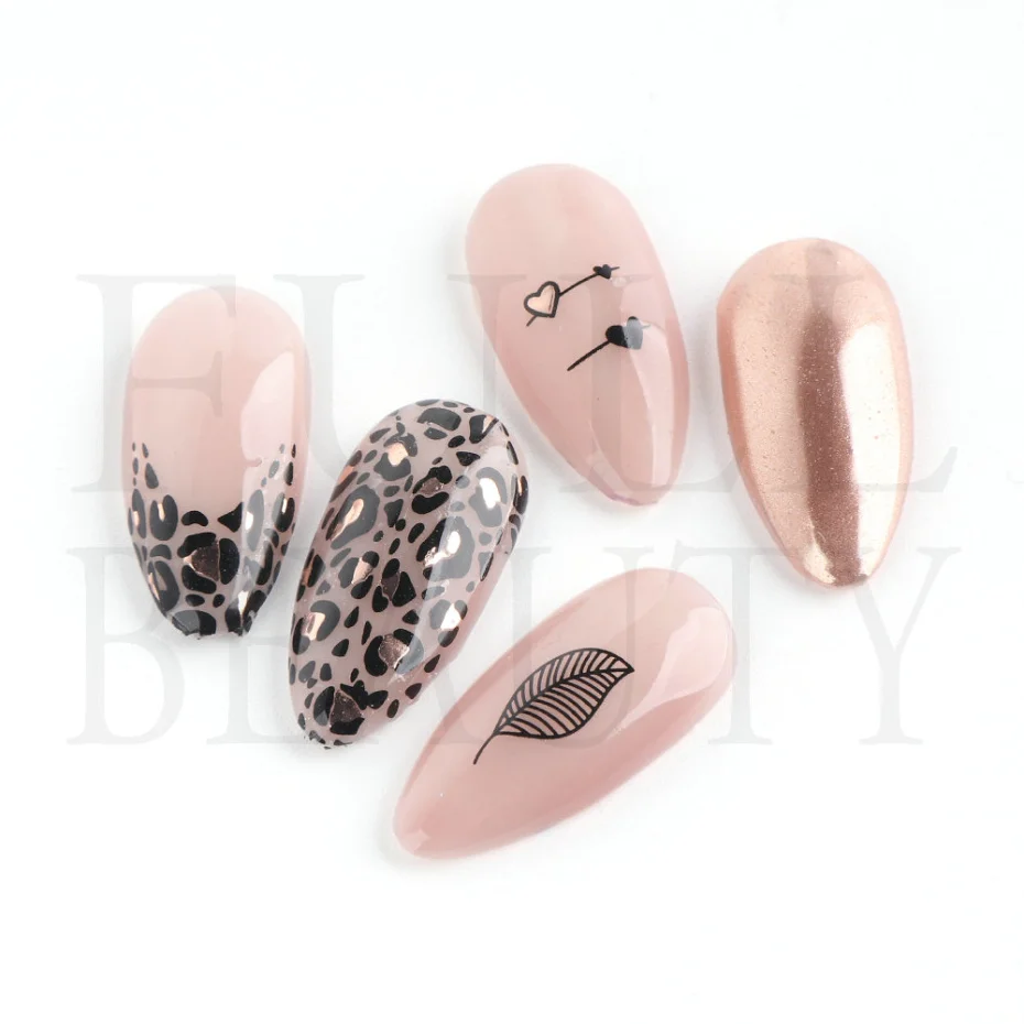Patterns: rose gold abstract leaves, woman face outlined by lines, love hearts, eyes, summer flowers leaves, leopard print, animal skin, lacquer strips,spring 3D slider