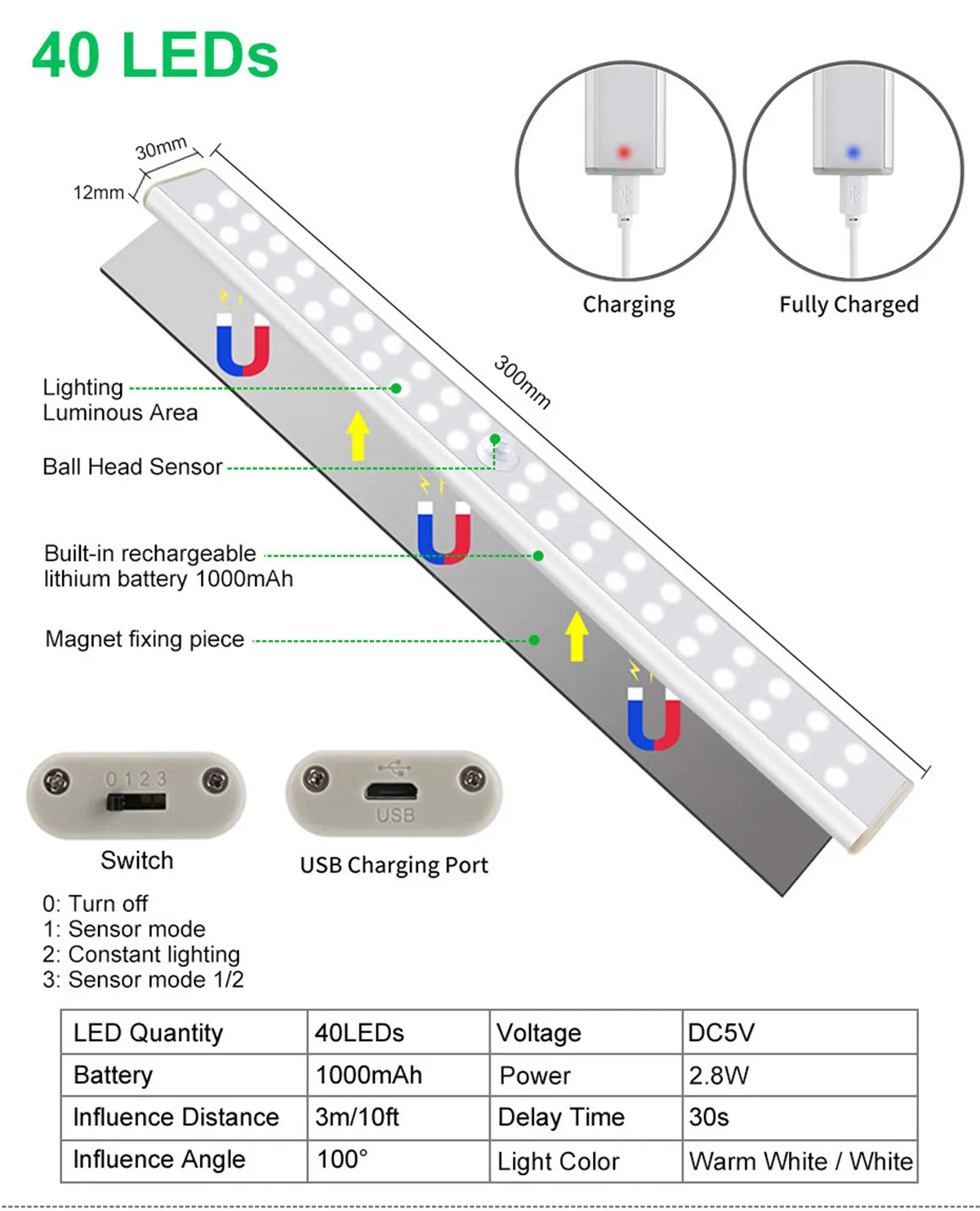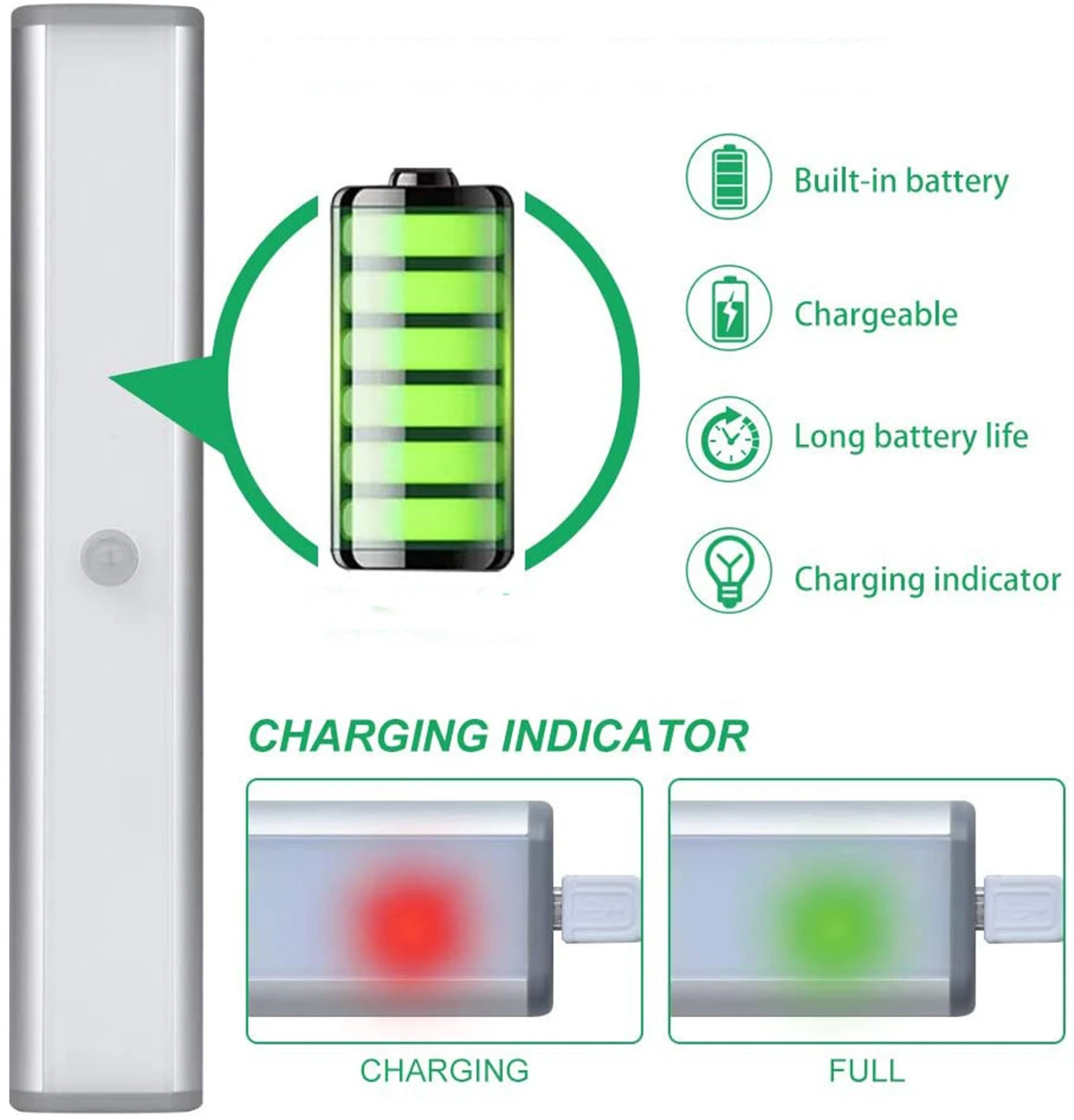 Built-in 1000 mAh high-capacity rechargeable battery, has larger battery capacity than other led cabinet lighting, easily to charged via USB. After fully charged, these closet lights last for up to 8 hours under on mode and last 1-2 months under motion sensor mode.