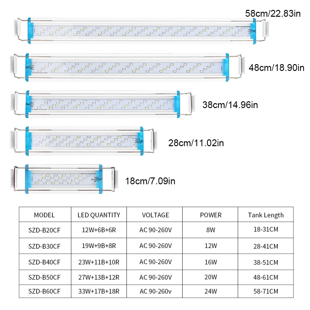 ![]() ![]() Aquarium Light Bar LED Fish Tank on Lamp Plant Growing Lighting Aquatic Landscape Decor 18-58cm Extensible Accessories 90-260V EU Feature: 4 rows of 5730 lamp beads, blue and white light, red and blue light, brightening light three mode adjustment; High brightness, high quality, suitable for aquatic plant growth, aquarium landscaping, and fish brightening; Light: blue and white light, red and blue light, white blue and red light; Specification: Item: ultra-thin aquarium light, brightening three-color adjustable, aquatic landscaping light, aquarium bracket light, LED illuminating light Material: Plastic+LED+Metal Style: 18/28/38/48/58cm Power: 8w/12w/16w/20w/24w Plug: EU Note: Due to the different monitor and light effect, the actual color of the item might be slightly different from the color showed on the pictures. Thank you! Please allow 1-2cm measuring deviation due to manual measurement. ![]() 1 X Aquarium Light Bar ![]() ![]() ![]() ![]() ![]() ![]() ![]() ![]() ![]() ![]() ![]() ![]() ![]() ![]() ![]() ![]()