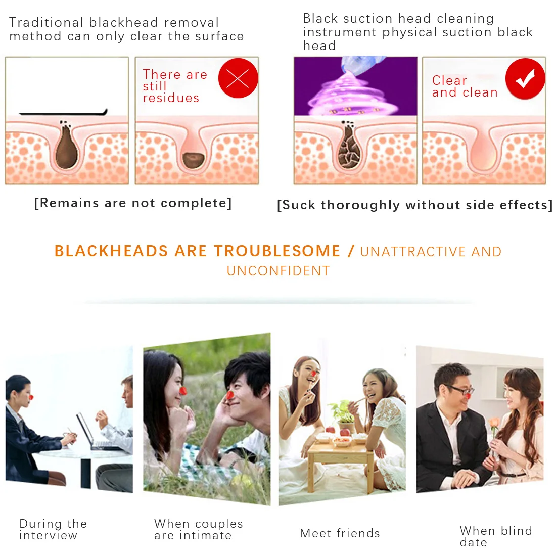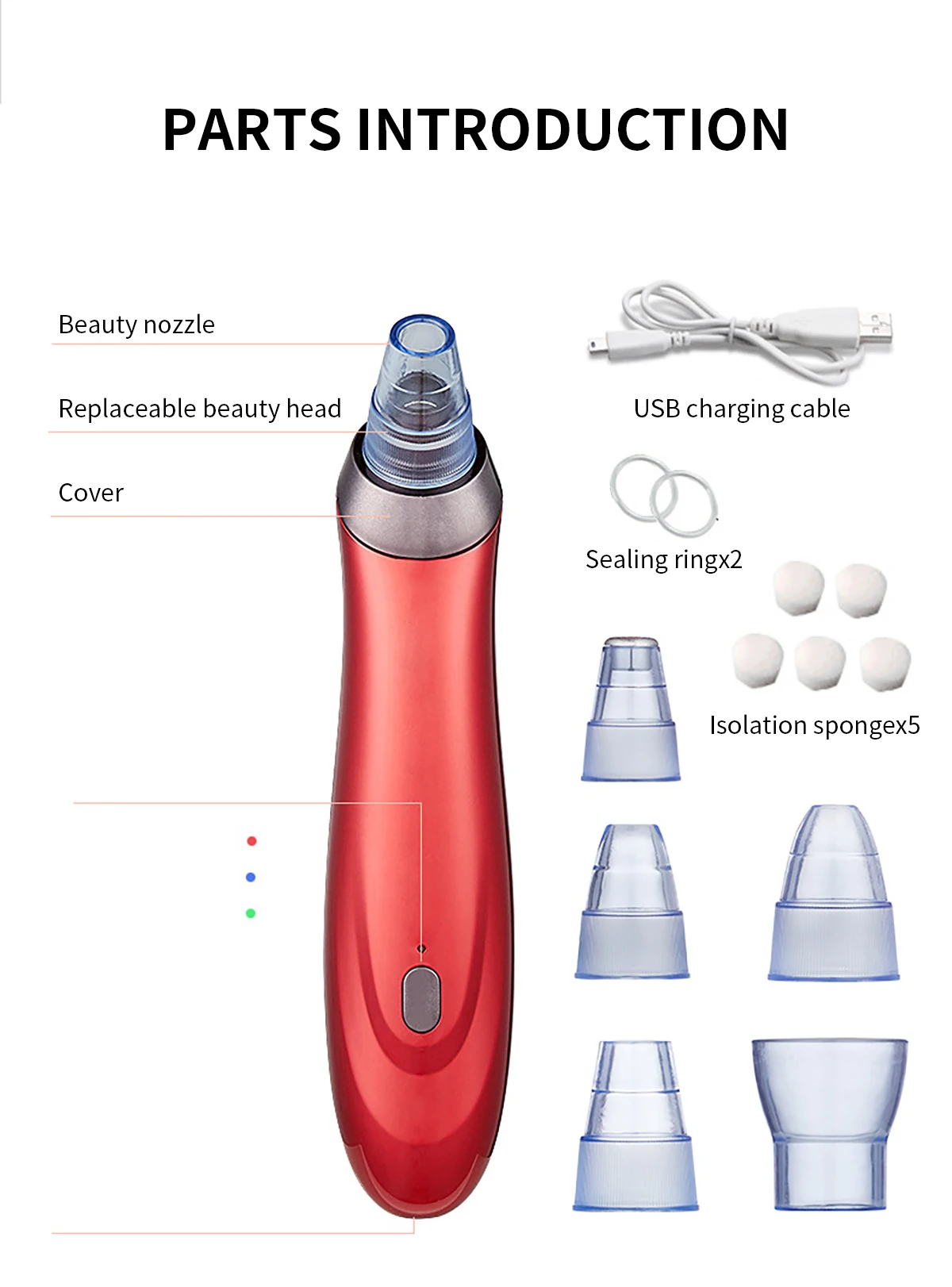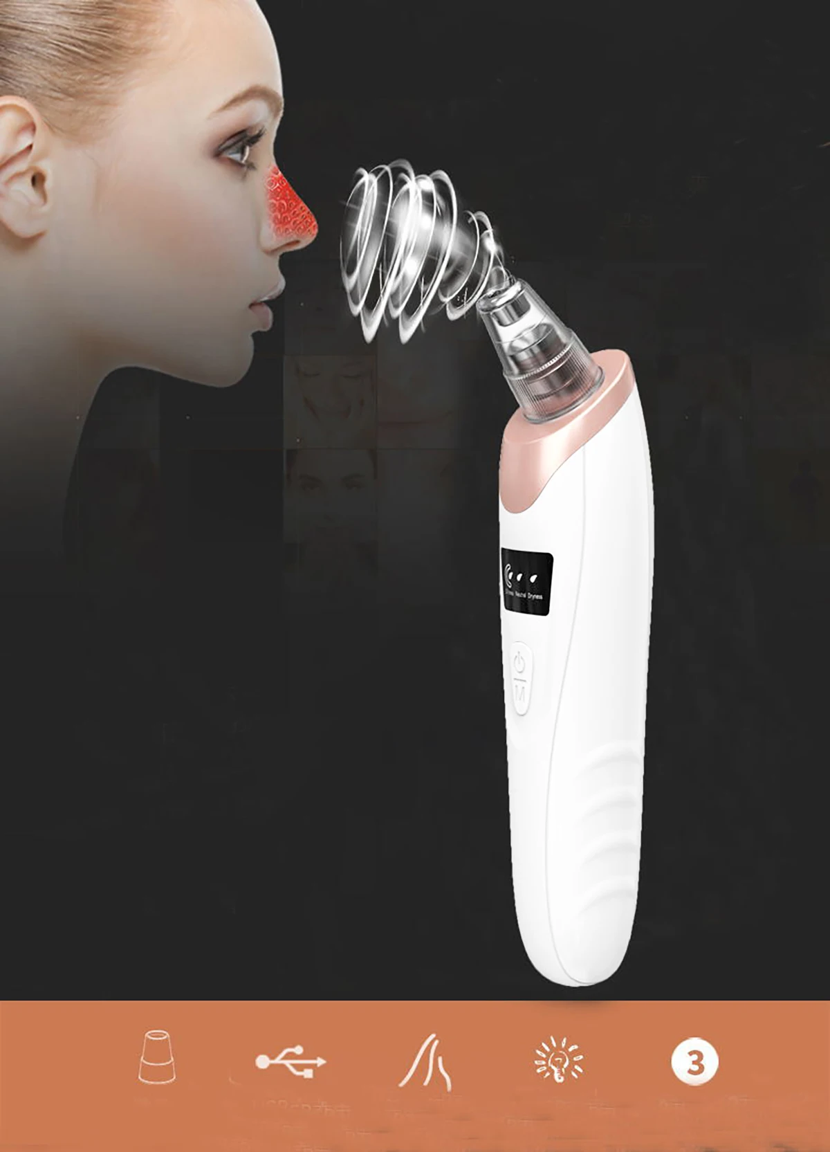 ✍ The small round head is used for sucking black head, especially suitable for fragile skin. The suction power is very weak.