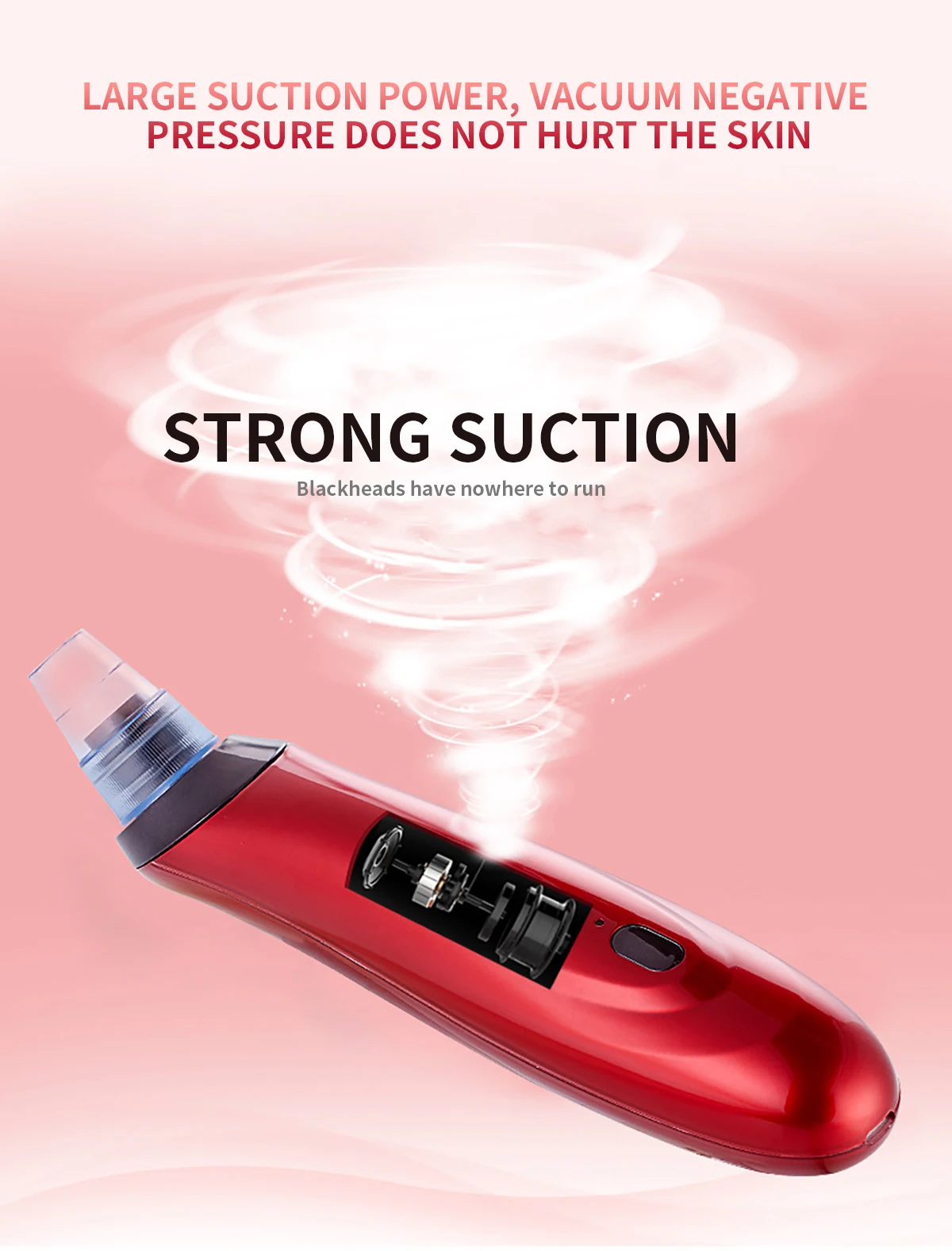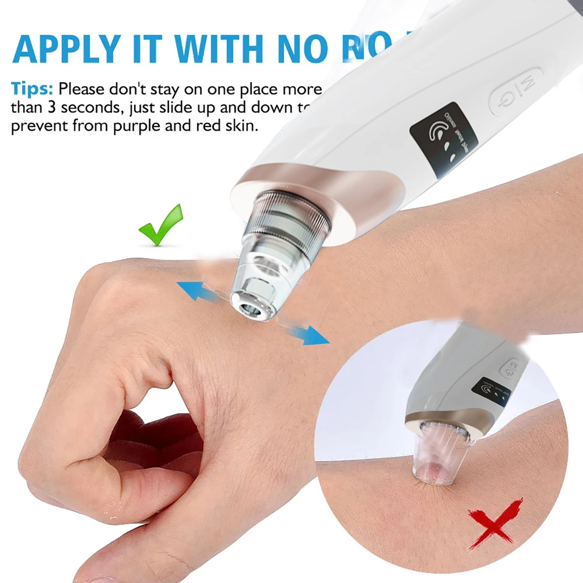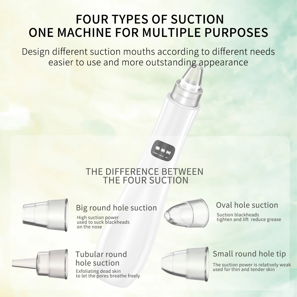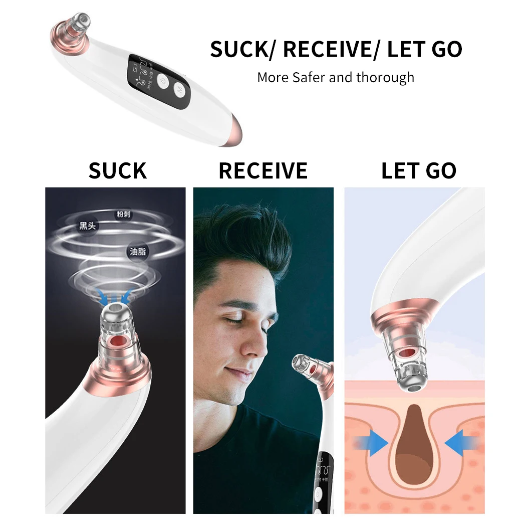 The product has 3 suction levels for meet different skin types, and protect your skin from damage, you can adjust it according the blackhead severity and skin types.