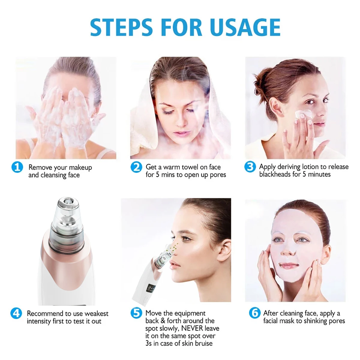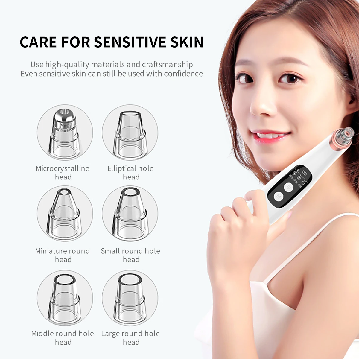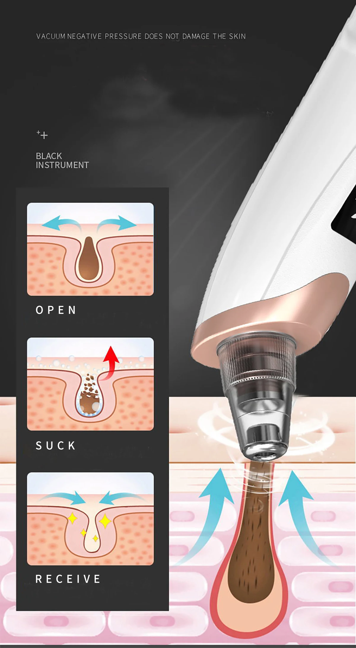 The product has 3 suction levels for meet different skin types, and protect your skin from damage, you can adjust it according the blackhead severity and skin types.