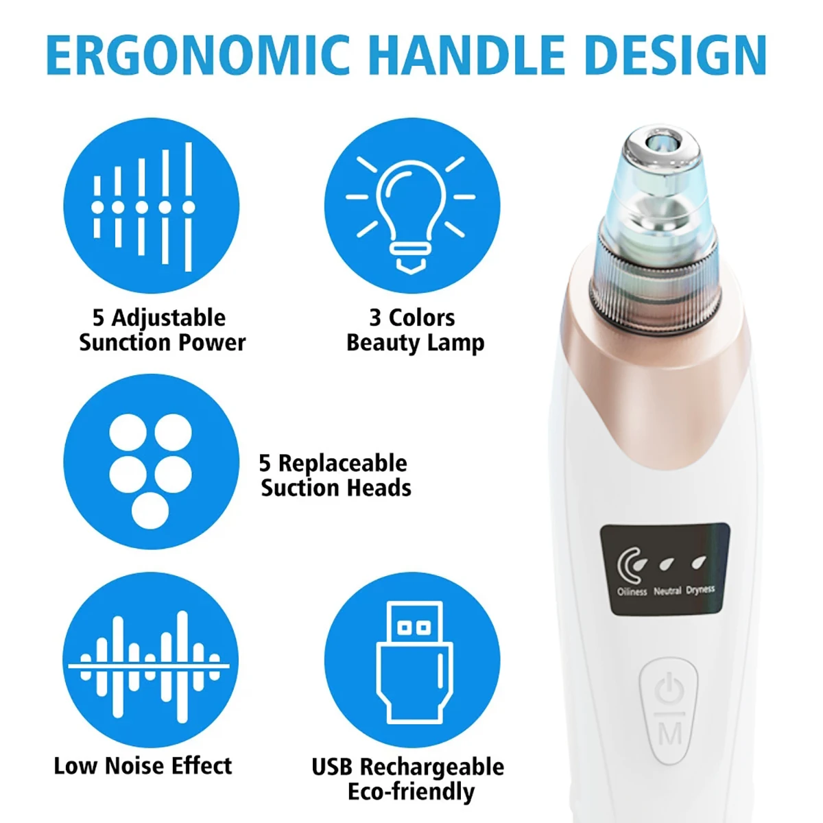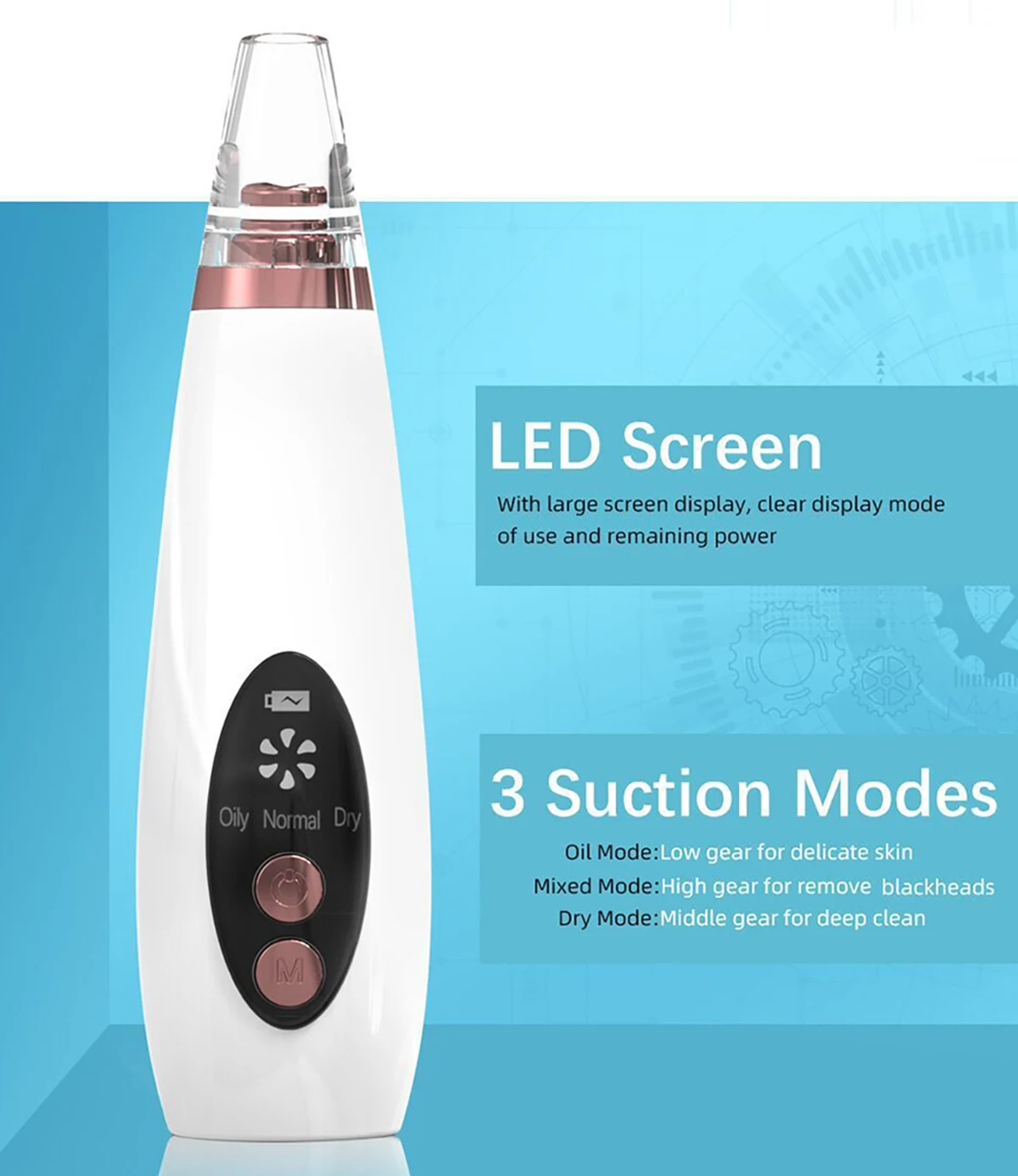 ❤There are there optional modes, big suction for oily skin, medium for dry skin, low for normal skin. One key operation.