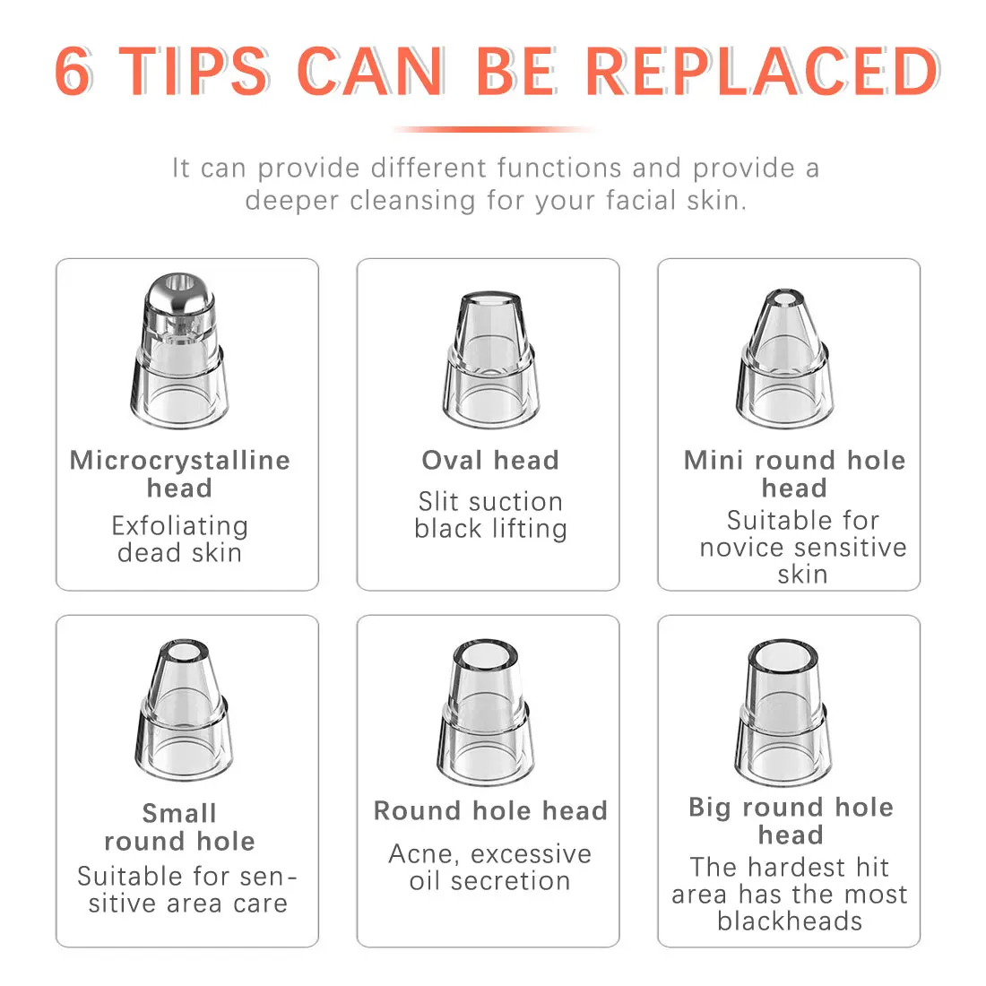 The whole set will solve all your need, remove blackhead, grease, cosmetic residue, pimples, wrinkle from different parts of your face, also effectively for microdermabrasion, improving skin vitality, helping unclog pores and making your skin smooth and tighten.