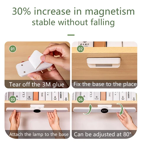 4. The base uses solid 3M glue, which can be fixed where needed. It can also be directly attached to iron objects without using the base. On the base, the angle of the lamp can be adjusted at 80°.