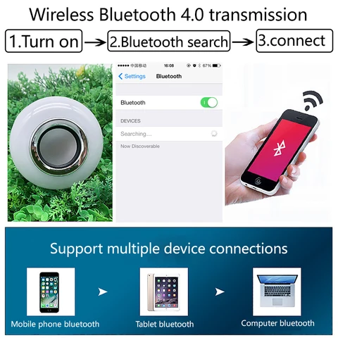 1.This bluetooth bulb is a wireless enabled, multicolored, energy efficient smart LED light. RGB colors & music playing can be easily controlled by remote. Works with bluetooth devices (iOS/Andoid/Windows).