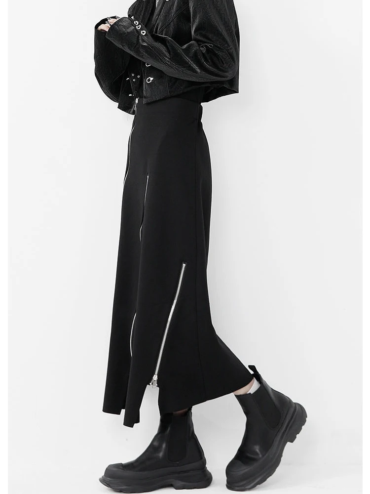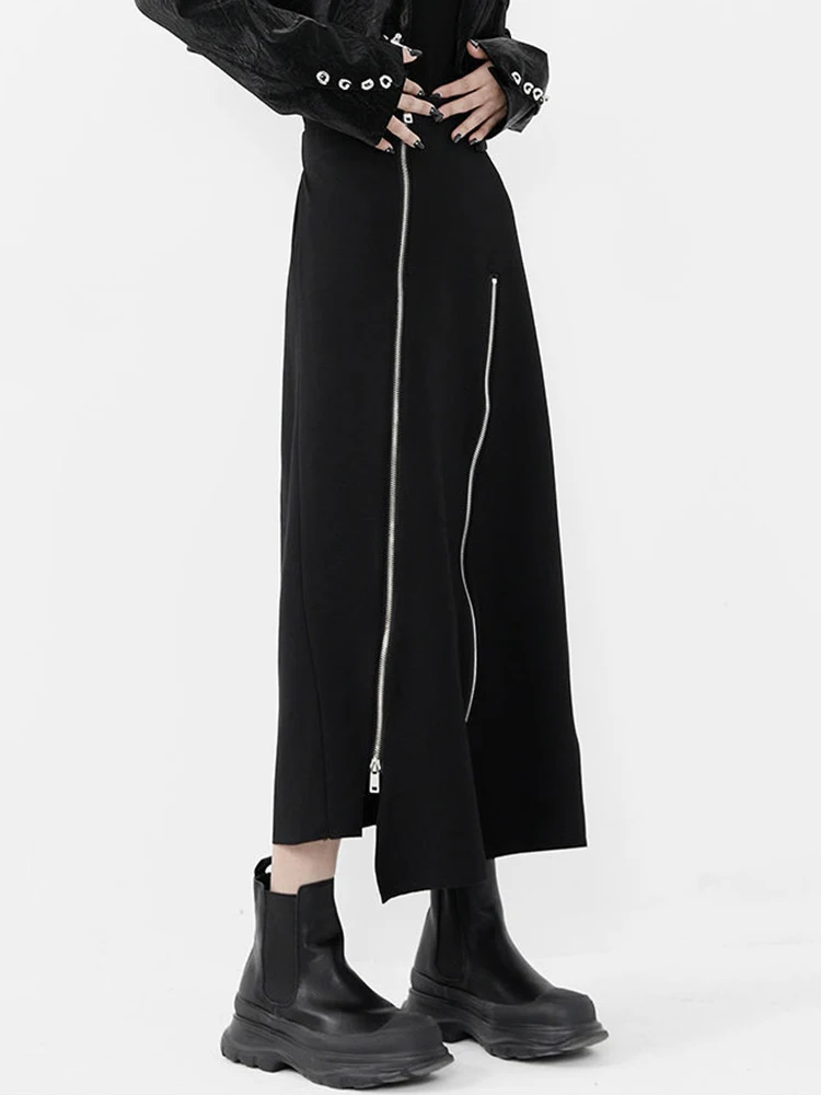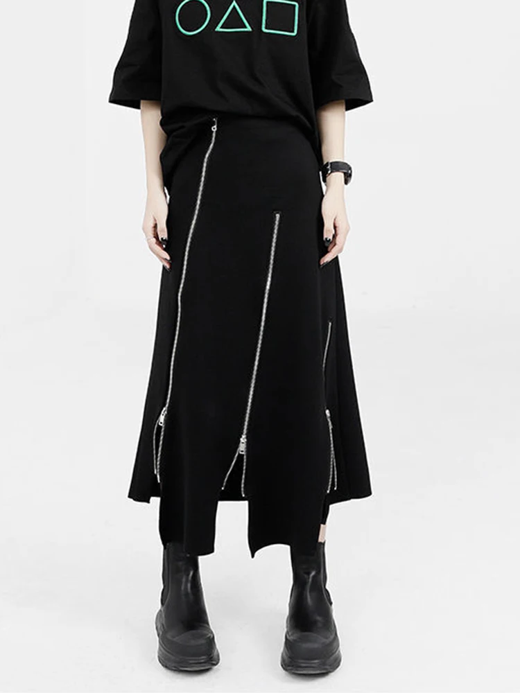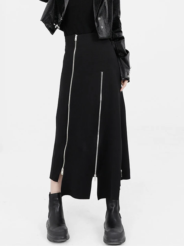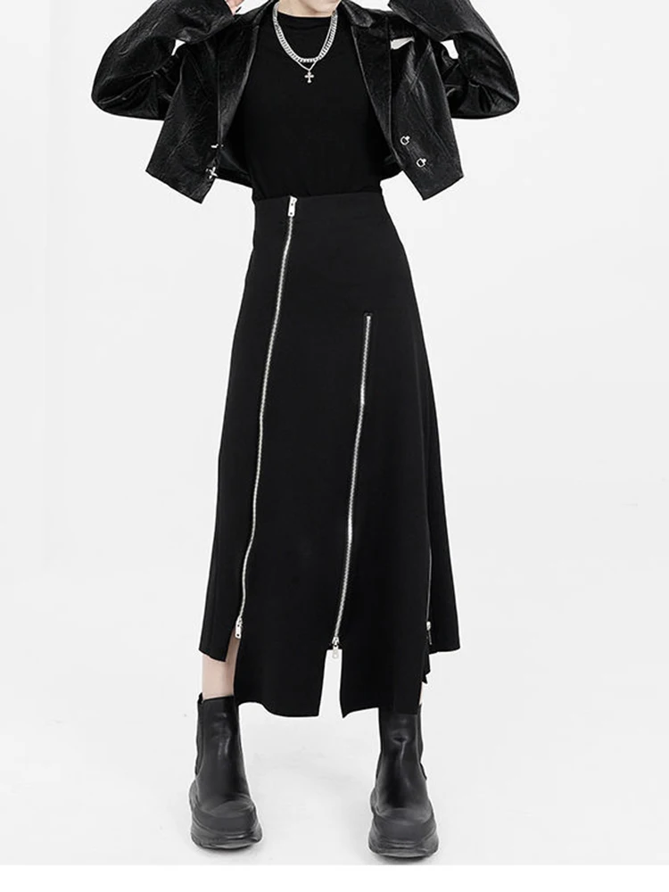 New Black Zipper Skirt Women A-line High Waist Mid-length Irregular Half Skirt Streetwear Loose Skirt