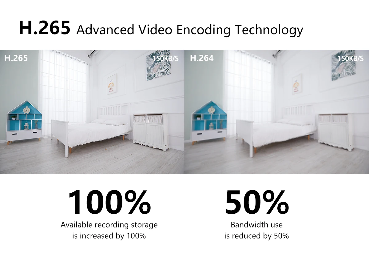 The advanced H.265 video encoding is more efficient and storage-saving, achieves less storage use and faster video streaming.