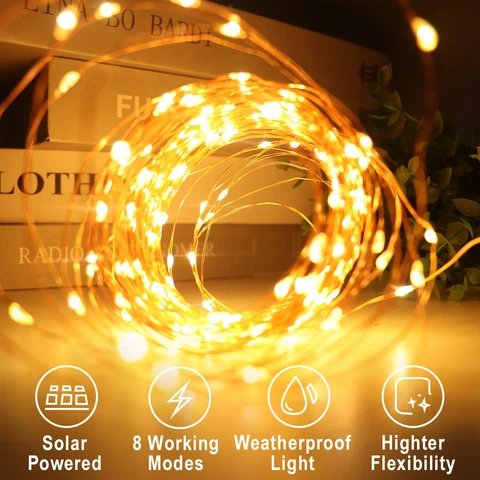 [High Quality Copper Wire Lights] - Our copper wire is super thin and flexible and the Solar Copper Wire Lights can be easily bended, and shaped around plants, signs, furniture and almost everything else. Meanwhile with low-heat-emission LED bulbs, the LED string lights will not overheat after using it many hours.