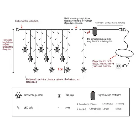 Reminder: The snowflake curtain light come with a plug cable. The length of the plug cable is 0.7 meters. If you feel that the cable is not long enough, you can purchase an additional 3 meter extension cable.