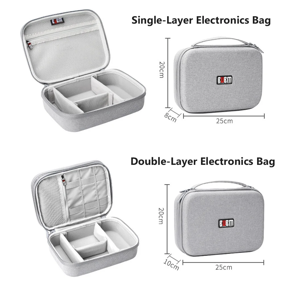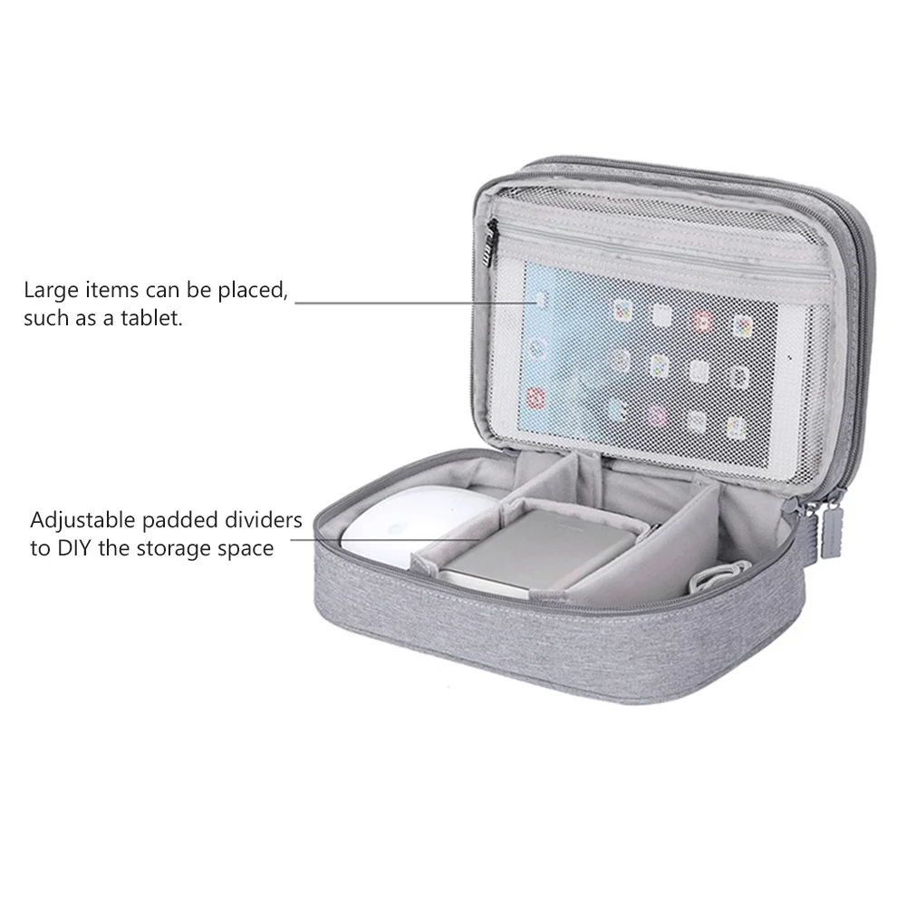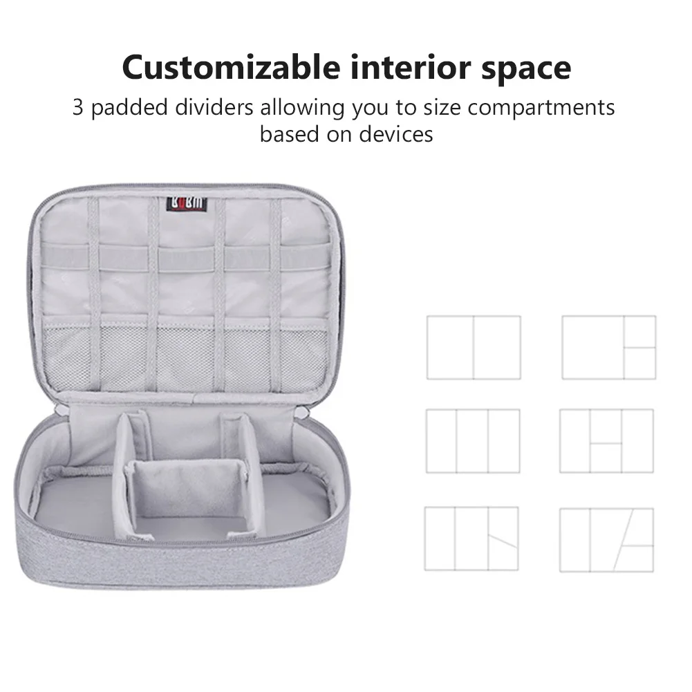 Adjustable compartments. Our electronics organizer has three detachable thick padded dividers with hook & hoop, you can DIY the storage spaces according to the size of your electronic accessories to keep them neat and tidy.!
