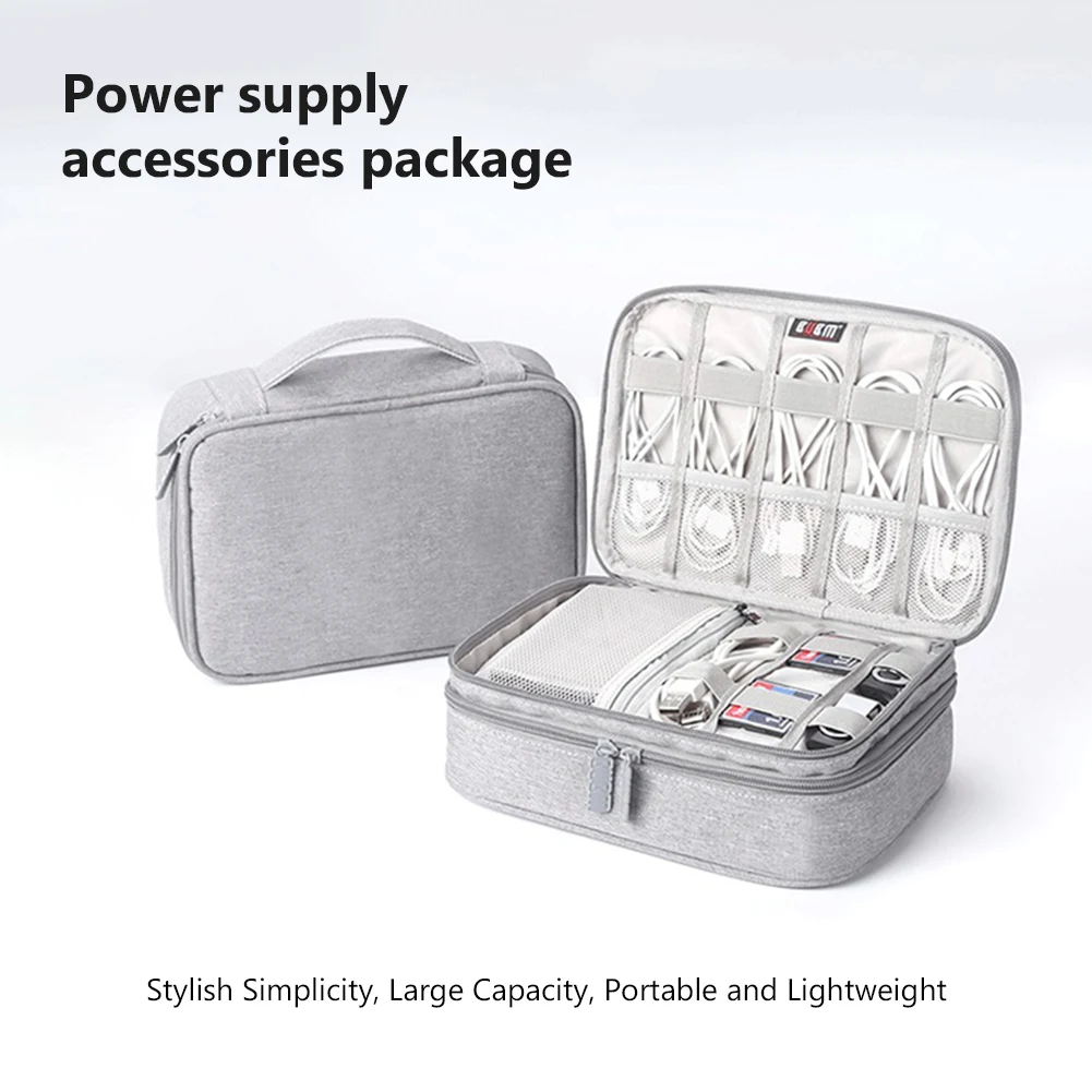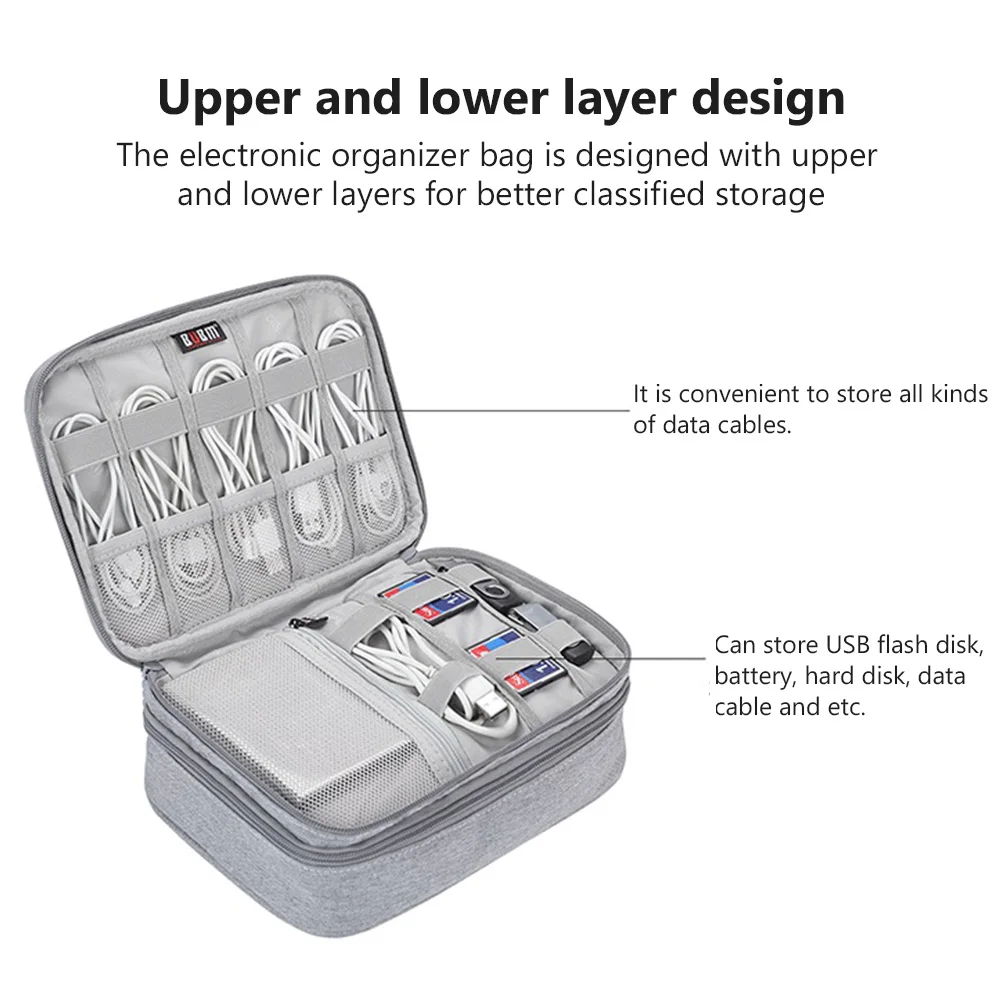 Keep everything organized. The large-capacity electronics storage bag has multiple pockets, detachable dividers, mesh pouches, elastic bands, can hold mobile phones, USB cables, chargers, headphones, power banks, hard drives, SD cards, also good for pens, stationeries, etc, easily separate and keep them in place.!
