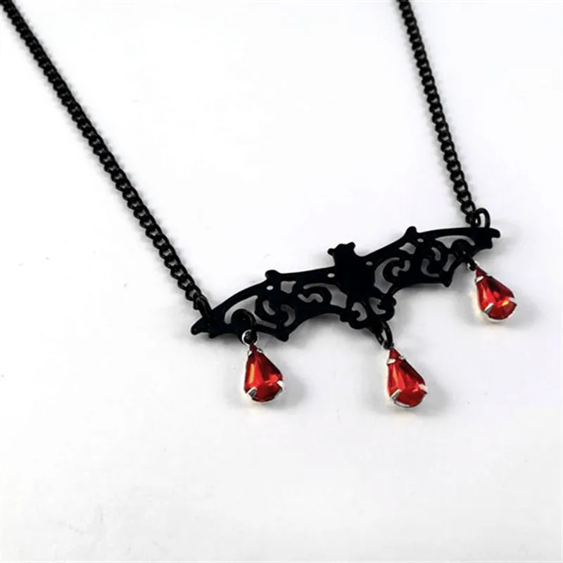 A stunning necklace featuring an ornate black bat and red teardrop shaped rhinestones.