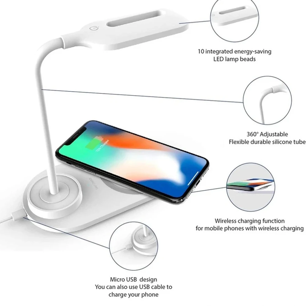 1. This LED wireless charger desk lamp is easy to use, can wirelessly charge mobile phones, and supports 10W charging power.