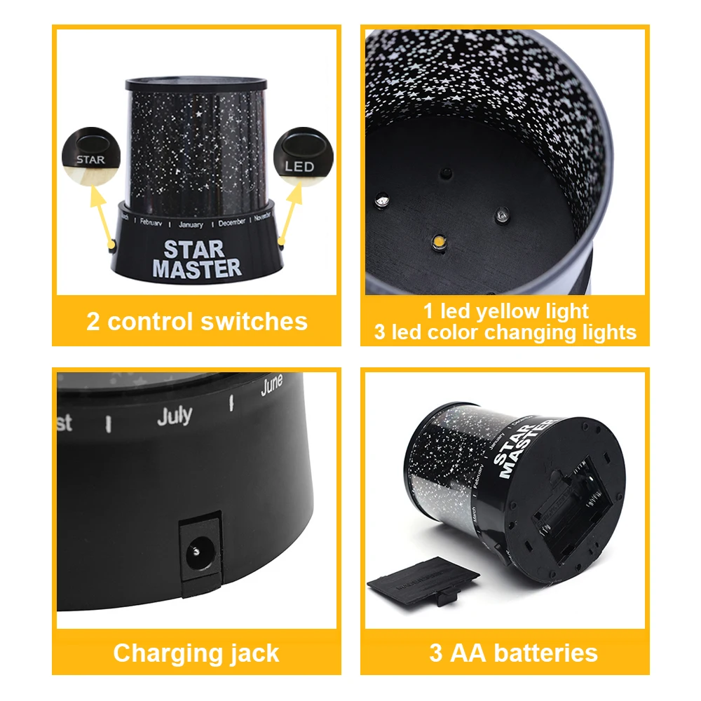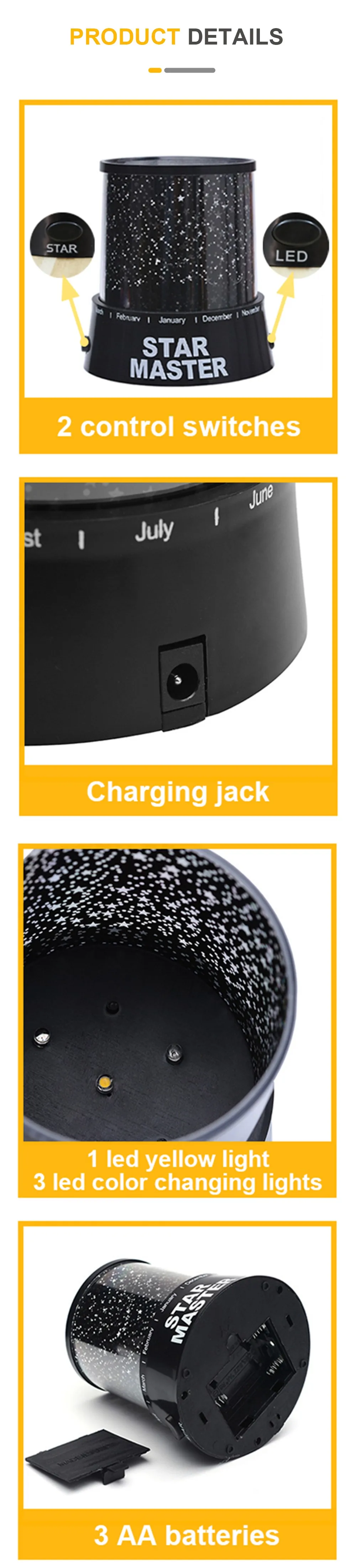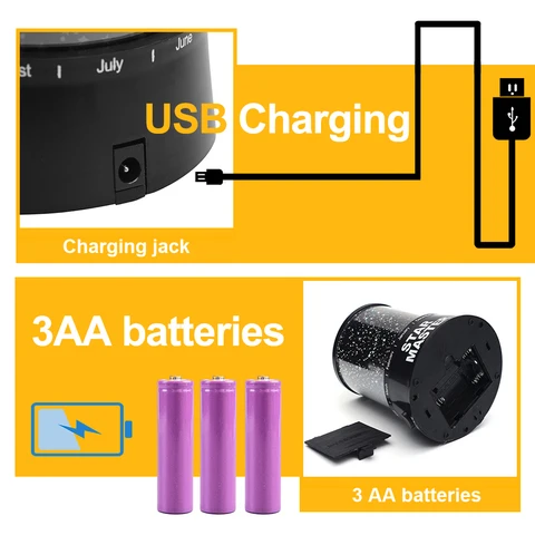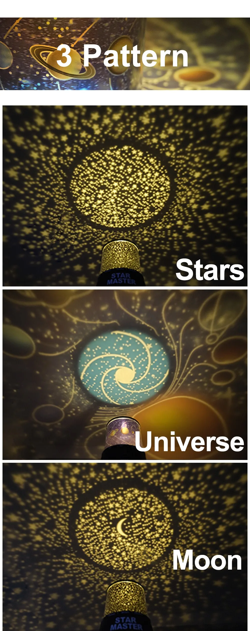 1.There are three different projection effects of moon, stars and universe, you can choose your favorite. The button switch is easy to operate and can be charged by USB or install 3 AA batteries.