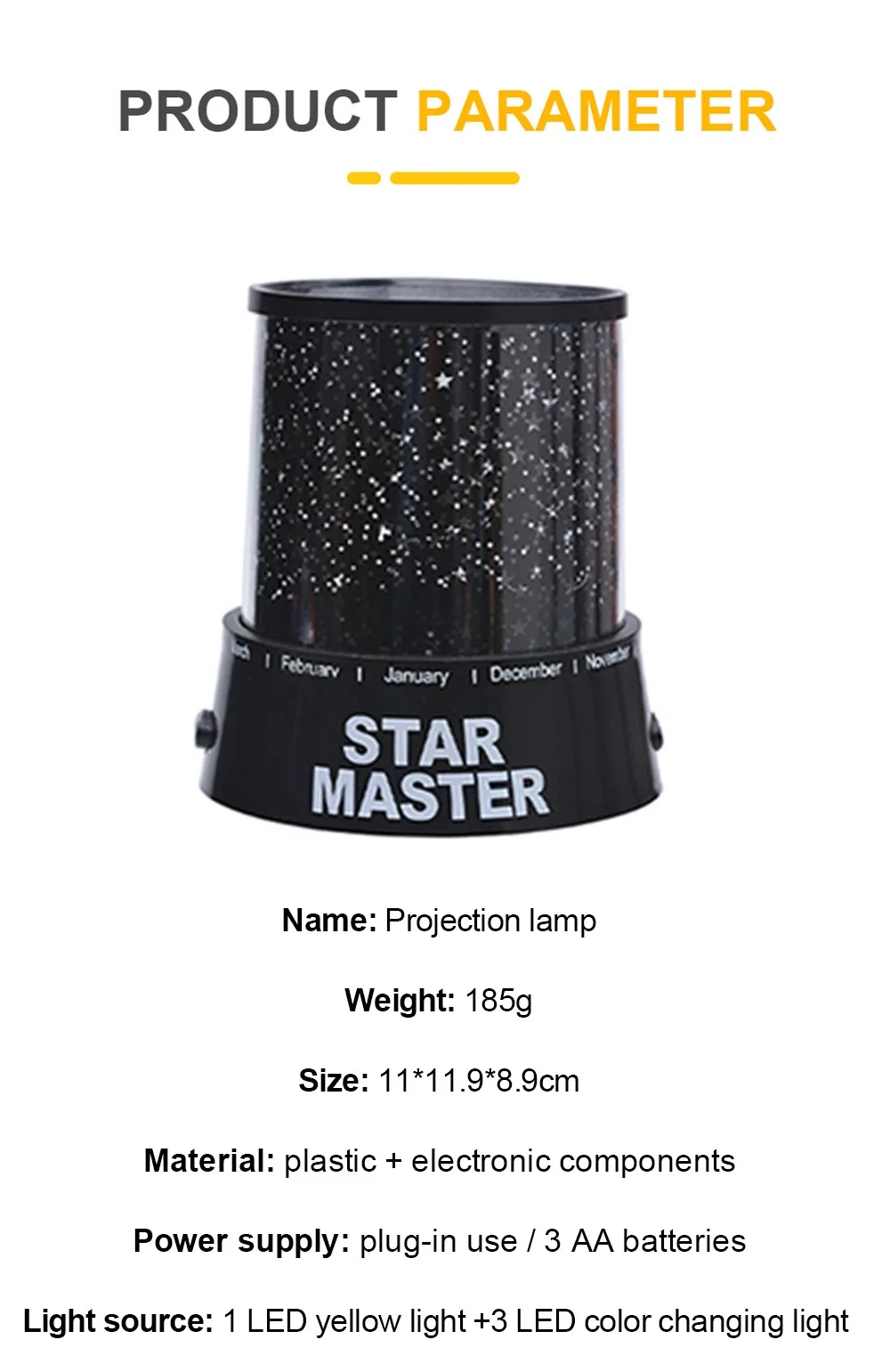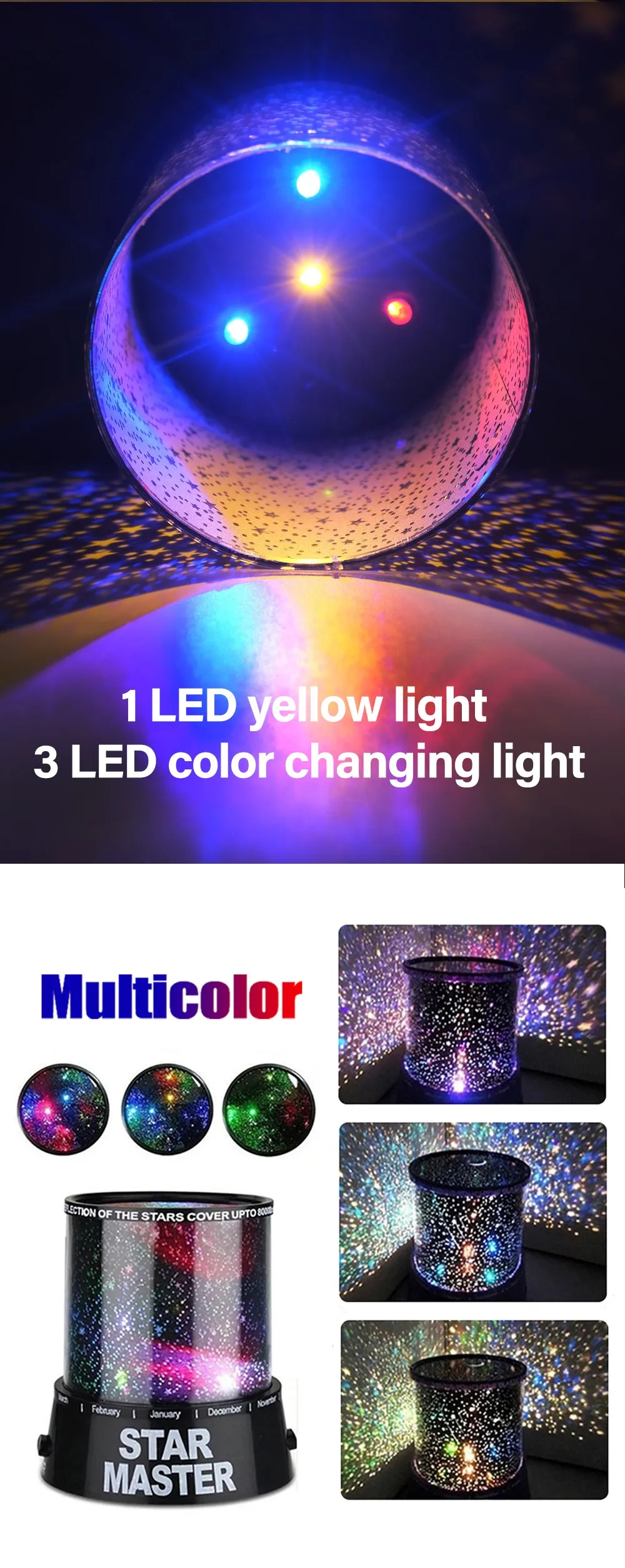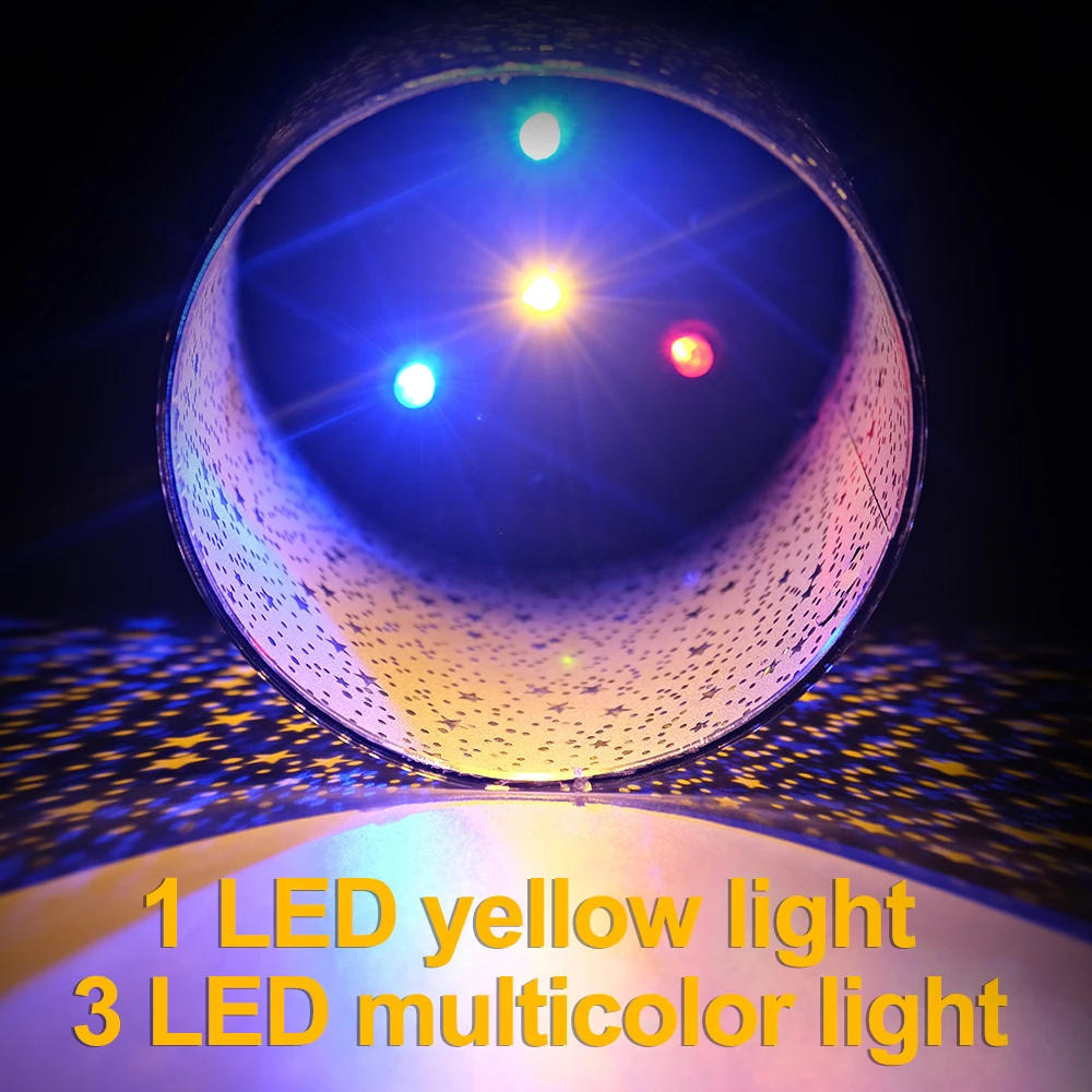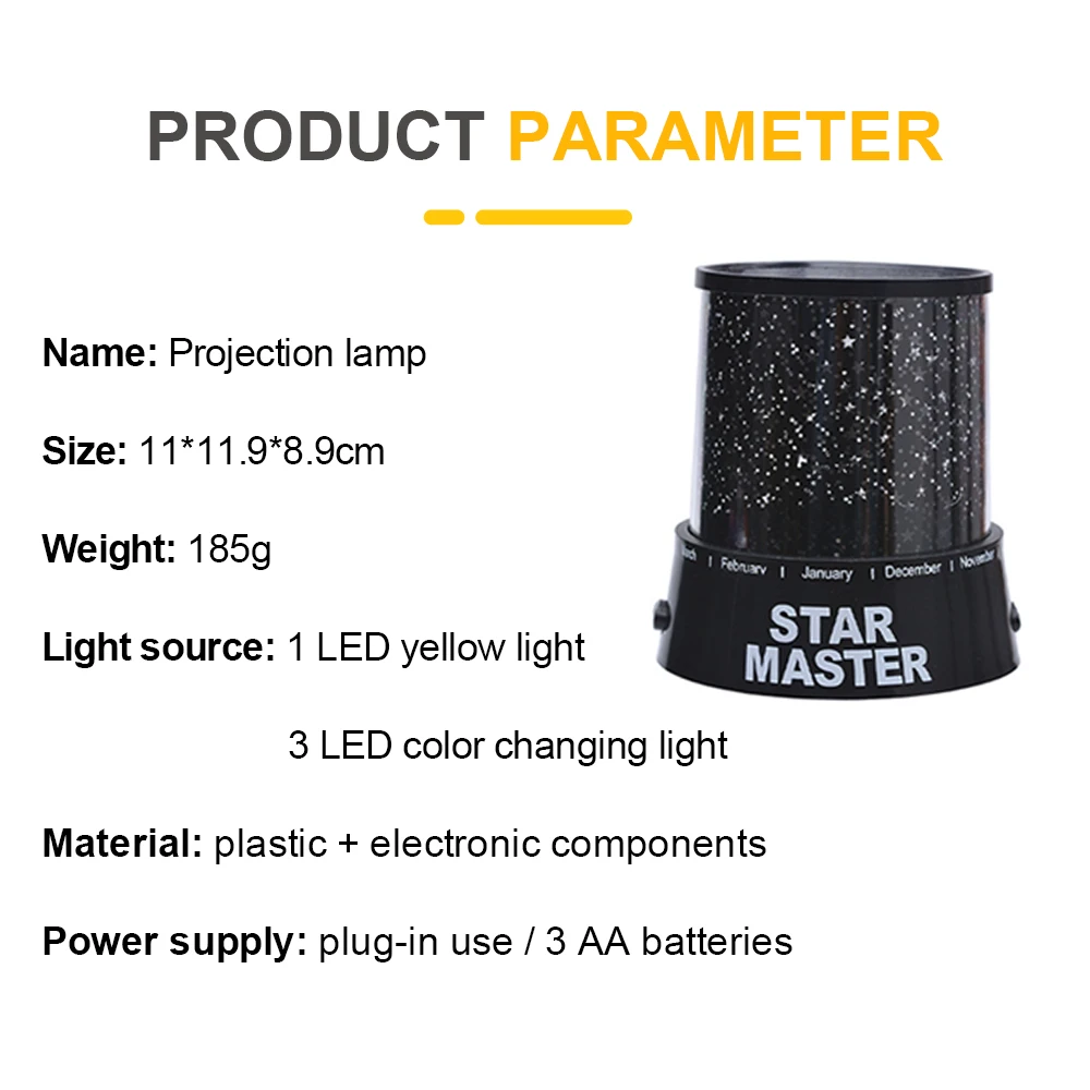 1.There are three different projection effects of moon, stars and universe, you can choose your favorite. The button switch is easy to operate and can be charged by USB or install 3 AA batteries.