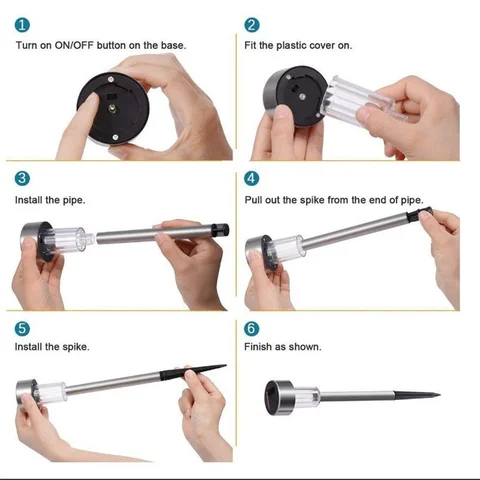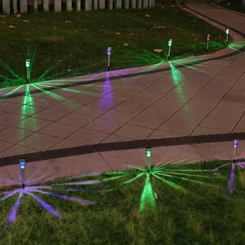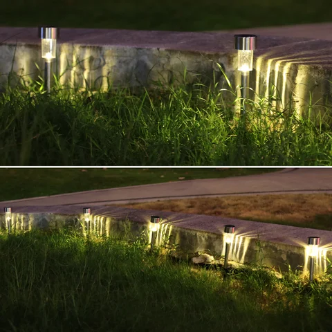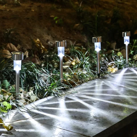Premium quality stainless steel bright white LED solar lights. Adopt latest improved solar panel, provides better performance and prolonged usage time. The solar panel converts sunlight during the day time and recharge the battery. At night the light turn on automatically. Light assemblies, stake sections, connectors, and durable ground spikes are included. This energy-efficient, low-maintenance solar lights add a charming, decorative glow to your driveway, patio, or flowerbeds.