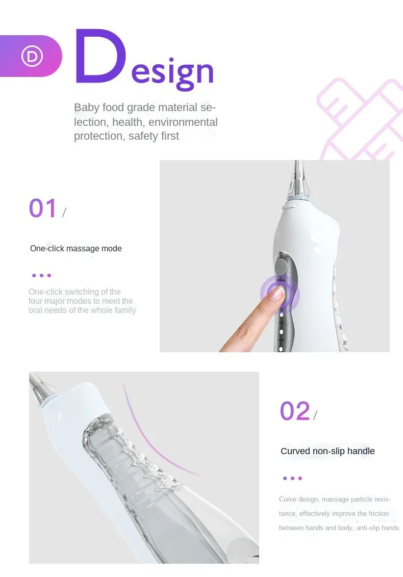 ● Large capacitytank,High frequency pulsed flow,USB charging,Three speed frequency conversion mode,0.6mm fine water column,IPX7 waterproof.