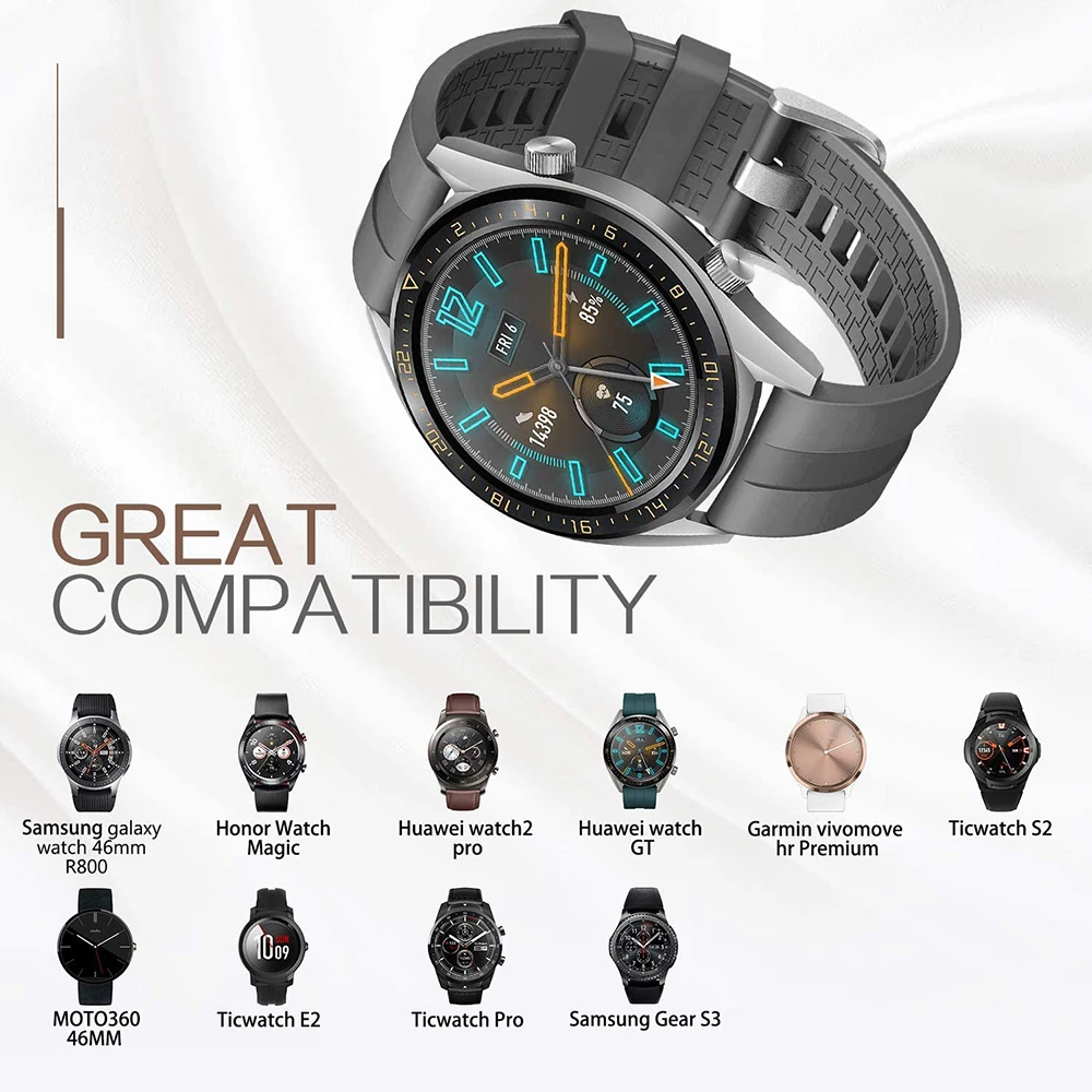 1. High quality and durable silicone 2. Band Width: 22mm 3. Made of solid stainless metal buckle 4. Compatible for all HUAWEI smartwatch with 22mm lug: for Huawei Watch GT2 Pro for Huawei Watch GT 2e for Huawei Watch GT 42mm/46mm for Huawei Watch GT2 46mm for Huawei Honor Watch GS Pro for Huawei Honor Magic Watch 2 46mm for Huawei Honor Magic Watch for Huawei Honor Watch Dream for Fossil Gen 5E 44mm