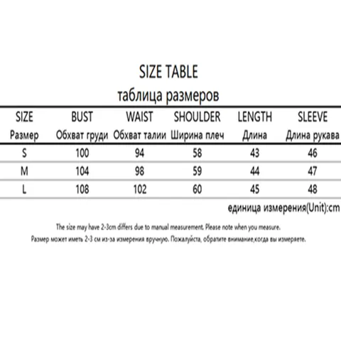 S Bust: 100 Waist: 94 Shoulder: 58 Tops Length: 43 Sleeve: 46
